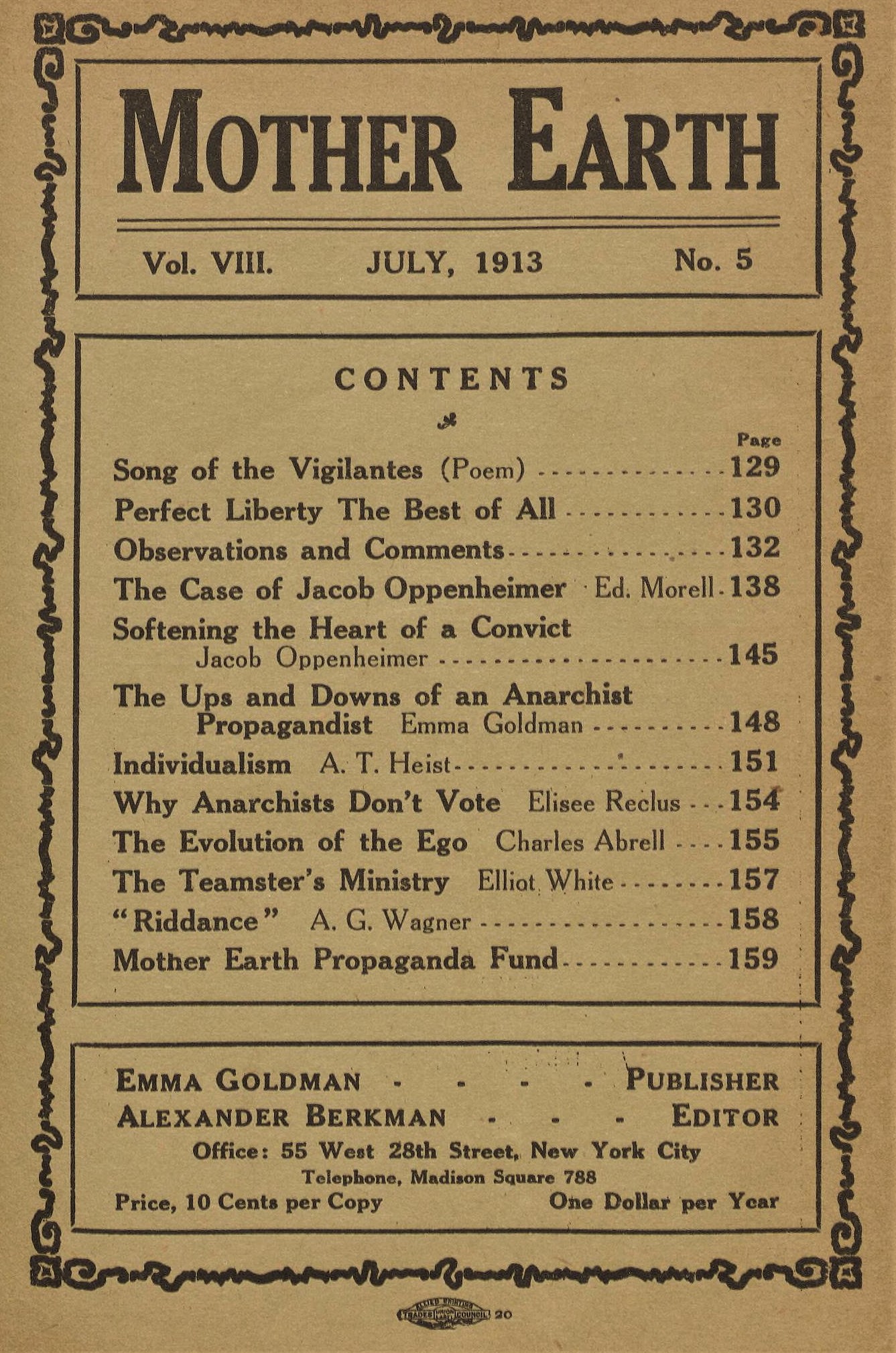 Contents: Song of the Vigilantes (Poem), Perfect Liberty The Best of All, Observations and Comments, The Case of Jacob Oppenheimer by Ed. Morell, Softening the Heart of a Convict by Jacob Oppenheimer, The Ups and Downs of an Anarchist Propagandist by Emma Goldman, Individualism by A.T. Heist, Why Anarchists Don’t Vote by Flisee Reclus, The Evolution of the Ego by Charles Abrell, The Teamster’s Ministry by Elliot White, “Riddance” by A.G. Wagner, Mother Earth Propaganda Fund.