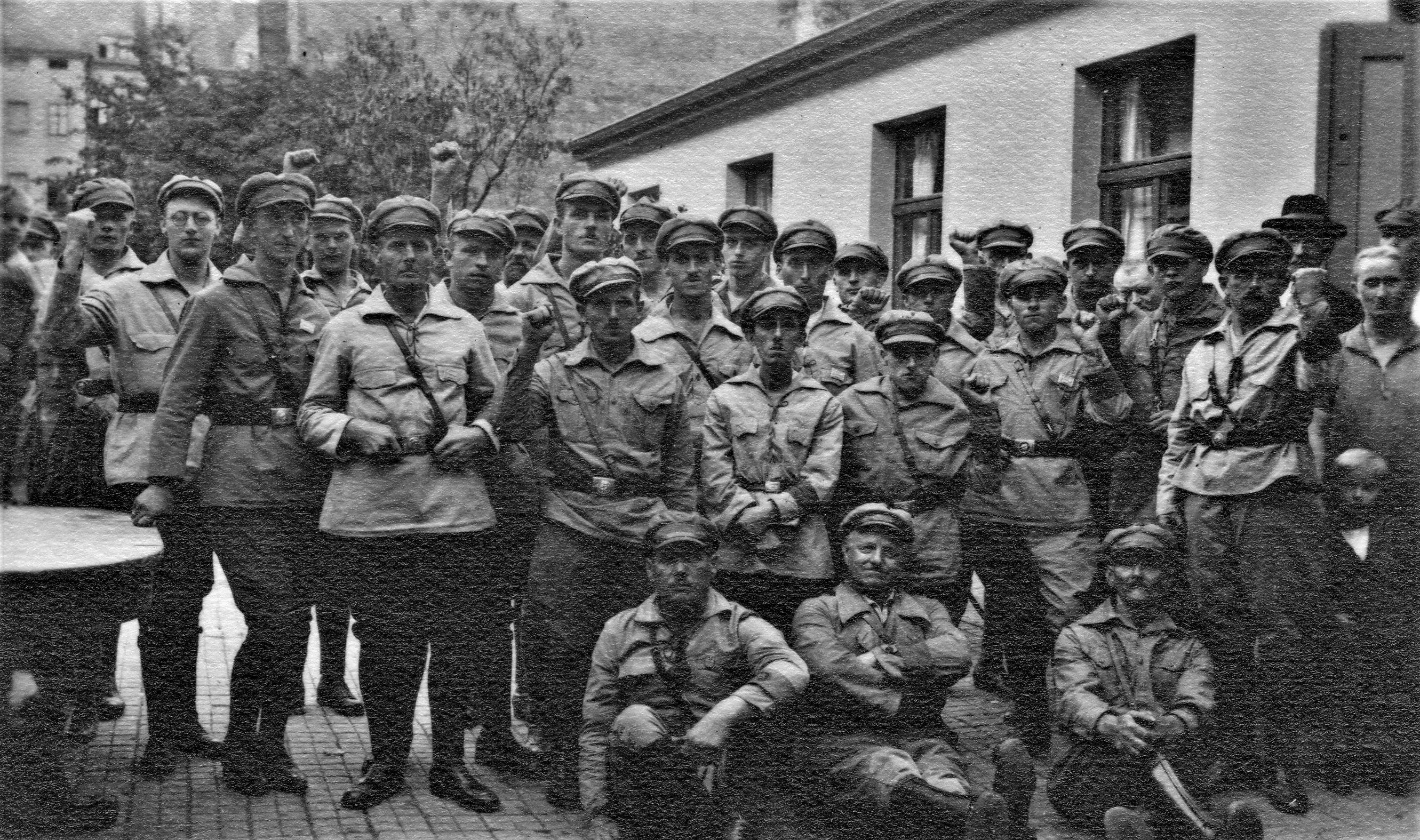 These Red Front Fighters are known as the “storm-troops of the proletariat,” organized in 1924 to counteract the growth of Fascism, to defend the class, and, in case of another war, “to turn upon the capitalist class and change the war into a civil war for the destruction of capitalism and the establishment of a workers’ and peasants’ government.” They are organized on a military basis and wear a gray uniform that looks much like the Russian Red Army uniform or the uniform of the Chinese Nationalist soldiers. The coat is half shirt, open at the throat and caught in at the waist and over the shoulder by leather straps. The cap, of the same material, has a solitary red star in front. Practically all men over twenty five had military training in the last war, and even the Red Youth—young men from the ages of 16 to 21—look as if they had had it when they swing down the street.