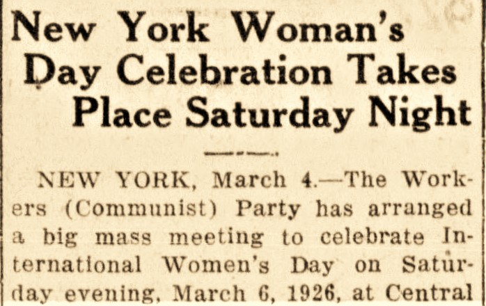 ‘New York Plans Intense Women’s Week Campaign’ by Margaret Undjus, Secretary Women’s Dept. District 2, W.P. from The Daily Worker. Vol. 3 No. 42. March 2, 1926.