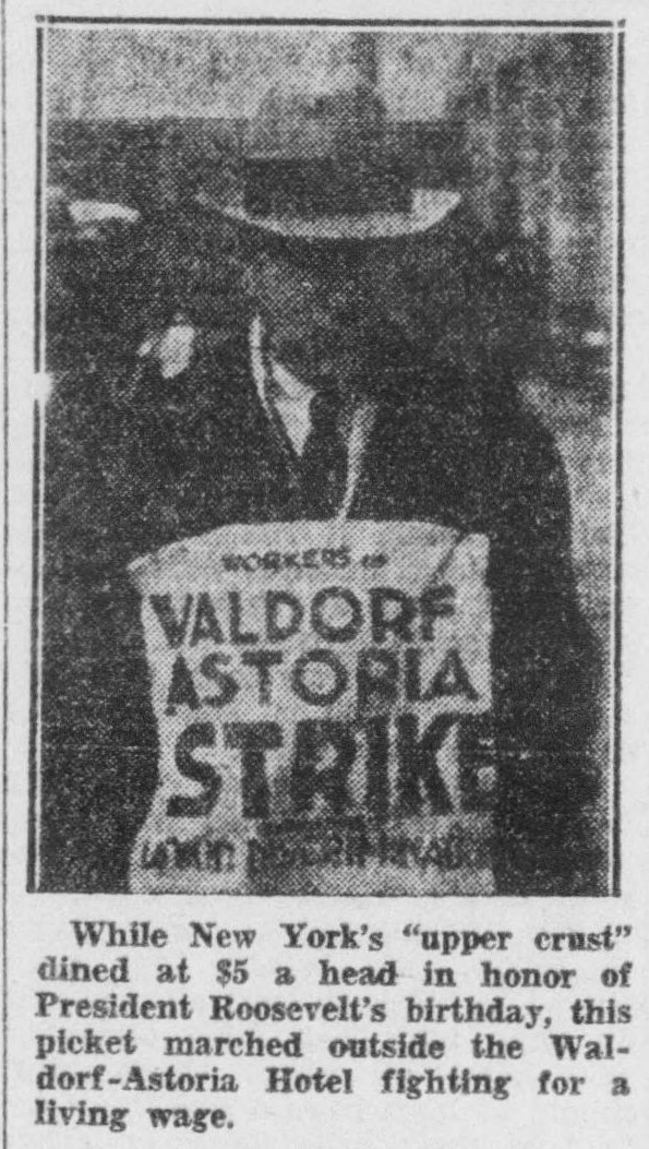 The strike continues- but unless unity is achieved the hotel workers trudging up and down the sidewalks of New York, their strike signs on their backs, will lose out. They face the police, the bitter winter weather, the strike-breakers, with heroic courage; but their disunity may defeat them. And then the starched shirts and silk-hatted guests at the Waldorf-Astoria can order their meals in peace once more.