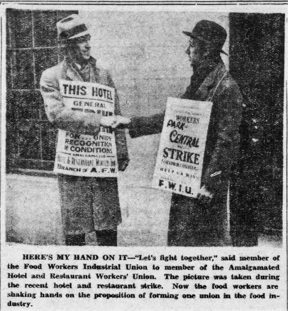 The F.W.I.U. has, since the beginning of the strike, hammered away for a united front. “Only unity can win the general strike,” say their leaflets, handed out in thousands before the city’s hotels. The strikers of Hotel New Yorker and the General Strike Committee of the Hotel and Restaurant Workers Union met and a decision was reached to join forces with the Amalgamated. They declared the necessity to “spread the strike to all hotels and to bring out the workers in all departments of the struck hotels.” The need for “united militant mass picket lines, united mass demonstrations” to force the owners’ association to grant the demands was stressed.