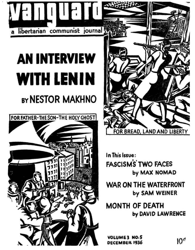 Contents: Makhno Interviews Lenin, War on the Waterfront by Sam Dolgoff, The Other Face of Fascism by Max Nomad, Towards Libertarian Communism by Mark Schmidt, The A.F. of L. Convention by Joseph Zack Kornfeder, November, War and Revolution by Luigi Bertoni, Spanish Revolution from an Ivory Tower, Spain’s Lessons Ignored by French Popular Front, Conference of Polish Anarchists, “Moscow trials” on Trial in New York, Libertarians in Support of Spanish Revolution, Vanguard Expands Activities, Another Important Center of Libertarian Activities.