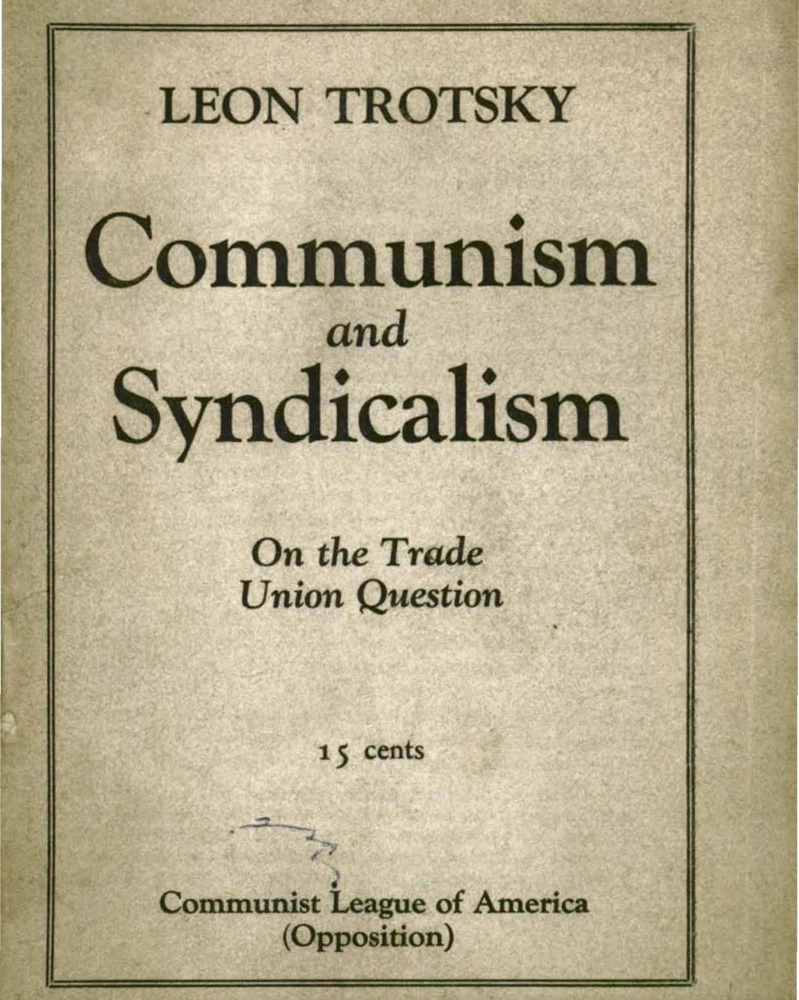 Contents: Introduction by James P. Cannon, A Necessary Discussion with Our Syndicalist Comrades (1923), The Anarcho-Syndicalist Prejudices Again! (1923), Communism and Syndicalism (1929), The Errors in Principle of Syndicalism (1929), Monatte Crosses the Rubicon (1930), The Mistakes of Rightist Elements of the Communist League on the Trade Union Question (1931).