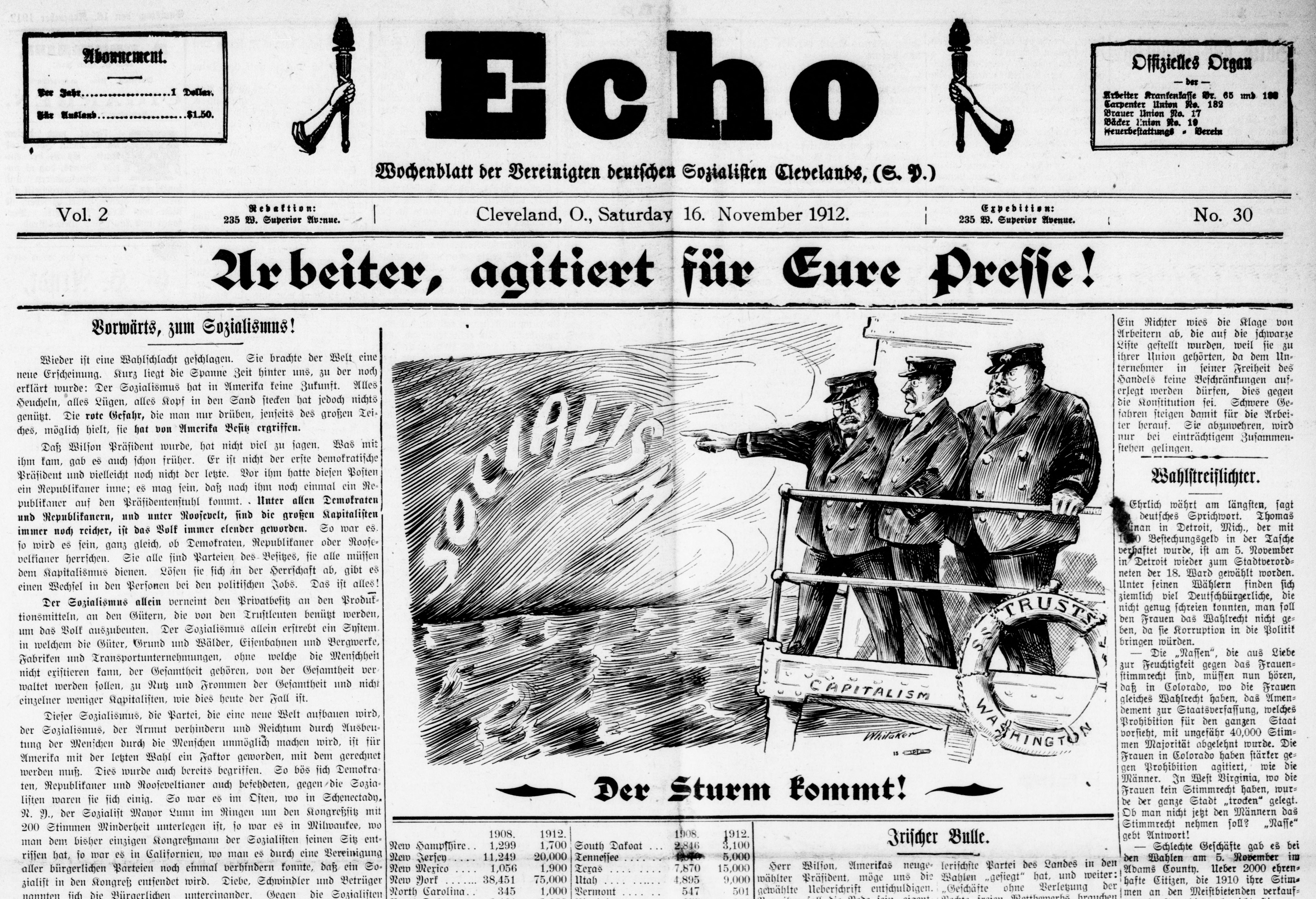 The Echo: Wochenblatt der Vereinigten Deutschen Socialisten Clevelands ‘Weekly of the United German Socialists of Cleveland’ was the paper of the United German Branches of the Cleveland Socialist Party, and the German Agitation Committee of the Socialist Party of Ohio begun in 1911. Wilhelm Ludwig Rosenberg was its first editor, others included Joseph Mosler, Fritz Frebe, and Herman G. Haupt. The Cleveland Socialist Party had six German speaking locals. The Echo had an anti-war stand and attacked German Socialists who supported the the war and social-patriotism.The Ohio German Federations were supportive of the Left Wing in the Socialist Party in their majority, but deeply divided over the CPA and CLP Communist factions. The Ohio German Federations did not survive the wars and revolutions of that period in tact. The paper ran until 1920.