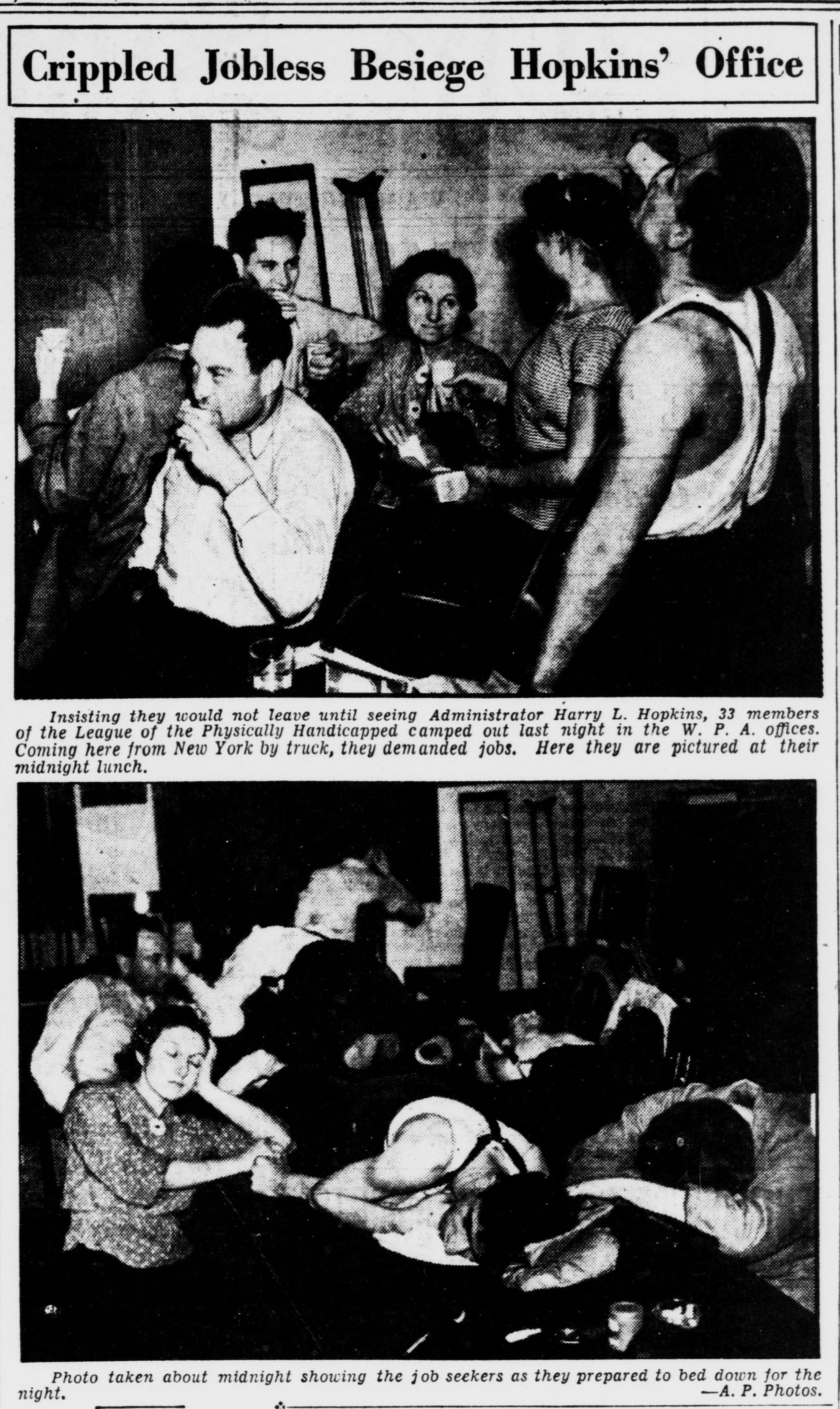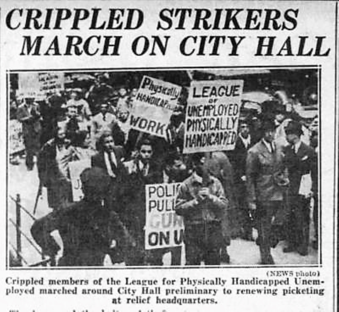 Do not be put off by the archaic language, this historic article by Communist Bob Brown on New York City’s League for the Physically Handicapped, formed in 1935 to protest discrimination in New Deal programs, marks one of the first left articles devoted to the issue, is serious and devoid of paternalism. The League engaged in direct action throughout that summer and fall; occupying offices, picketing and sitting in, winning a number of their demands and laying the basis for future disability rights’ movements.