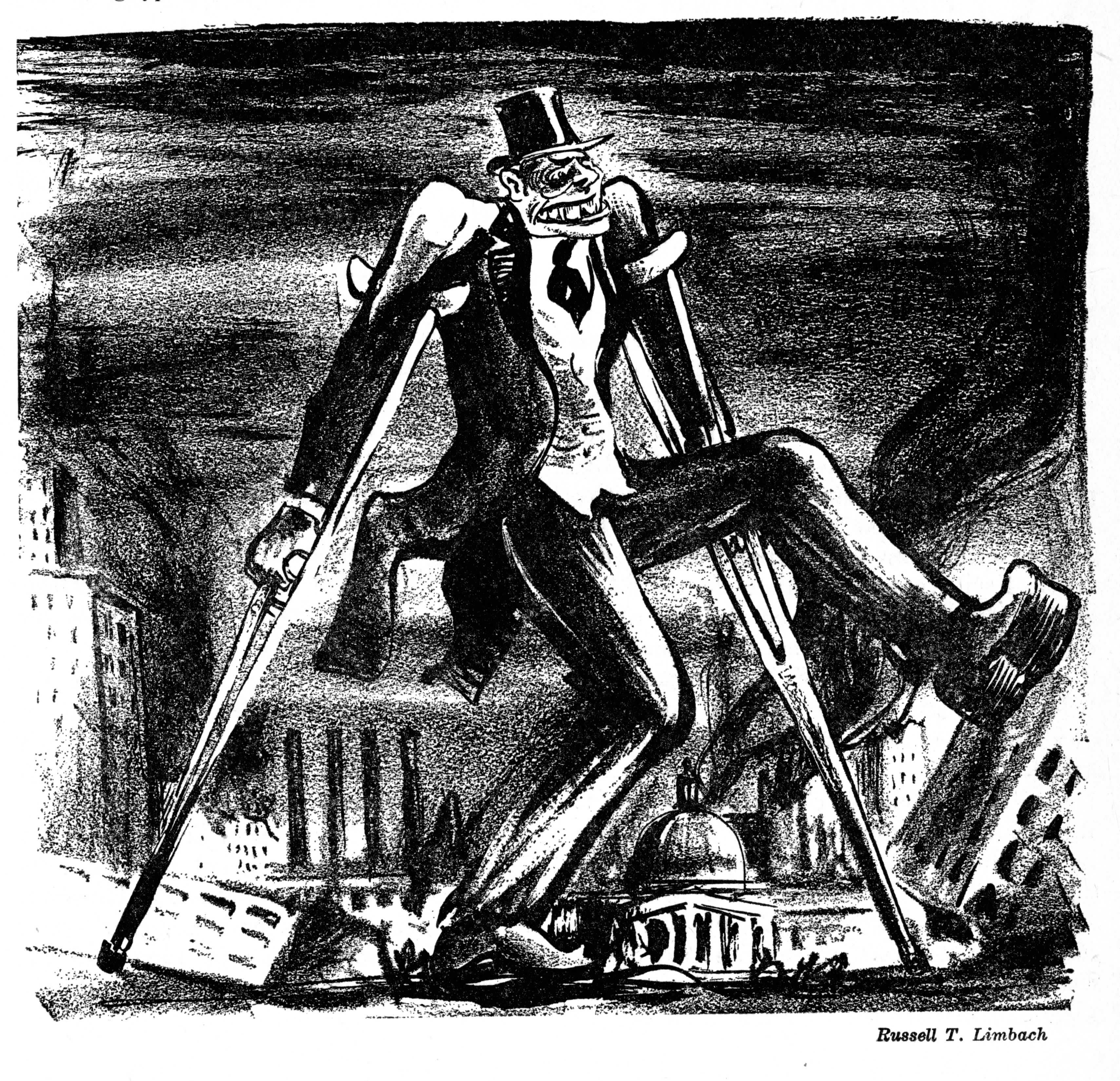 Show Ridder riding a crutch through this medieval picket line of 1935, depict his leering stool-pigeons trying to scare the crippled unemployed and hovering in the background, a gaga goofy ghost with jerky legs and a pepsodent smile soaring like a vulture over his White, White House. Make it biting. Make it- FUNNY AS A CRUTCH.