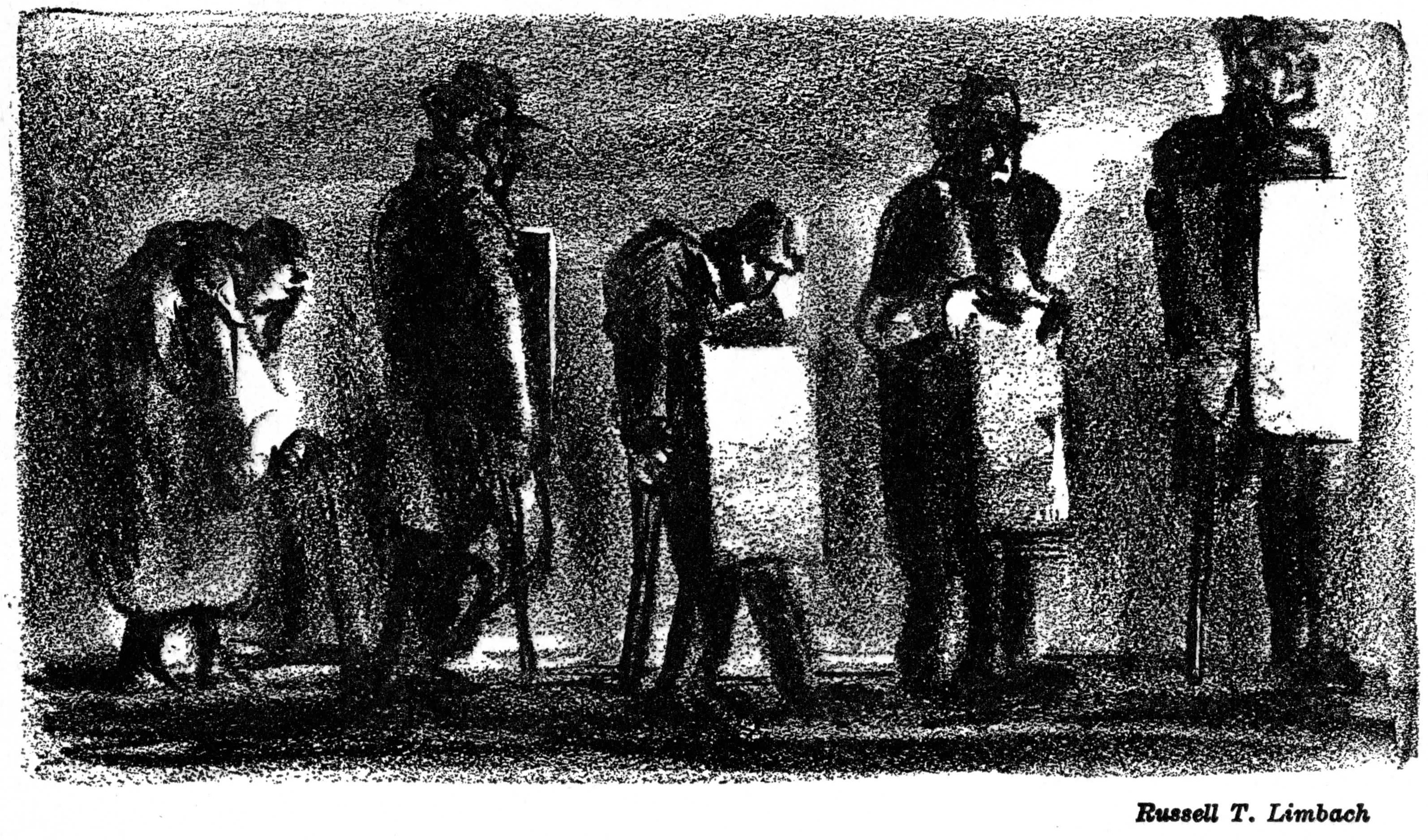 What now, old satirist Hogarth, and you, fighting Goya, who put down the truth of your own epochs in screaming lines, shivering and pulsing naked. You who depicted. Excruciating portraits of the physically handicapped in your own dim day- both of you great art rebels, painfully aware of the anachronism of this human holocaust of 1935, in a day when one-sixth of the world makes seven-league strides with full employment under socialism. One-sixth on the up-and-up, against five-sixths on the down-and-out. You who see everything, blink your eyes open today in this city of empty skyscrapers, this self-elected government of empty promises, this lousy metropolis where Jimmy Walker once danced in the West Side streets, not a bull-throw from the Cripple Picket Line. Observe this flowering thistle of civilization nodding on its bayoneted stem. Then take yourself to the nearest relief office, get a job on some artist project and do a mural on federal pay. Paint a collective picture of our collapse, never forgetting the upspringing beams of socialist light that show the way out. Make lithographs, drawings, engravings, etched inspiration for the masses. Dig your etching tools deep into the armored steel plate of unemployment for profit, dip your gravers into the biting acid, the poison of a decayed system that elects a cripple to the Presidency, appoints a cripple to administer relief in what, before socialism, was the most modern city in the world.
