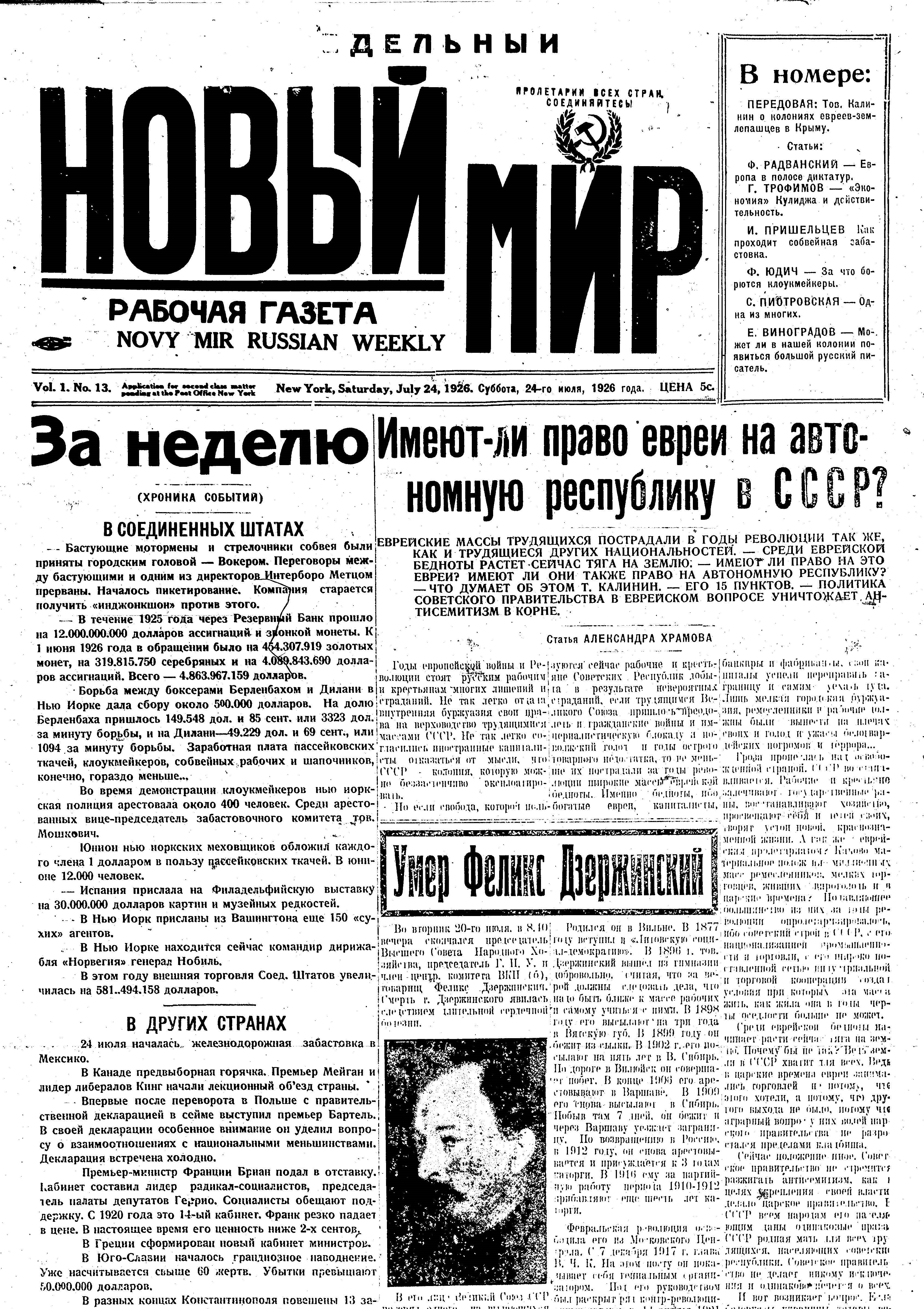 Novy Mir/ New World (New York). Vol. 1. No. 13. (New Series) July 24, 1926.