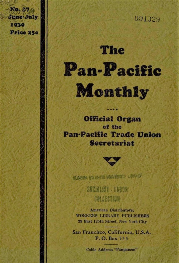 The Pan-Pacific Monthly was the official organ of the Pan-Pacific Trade Union Secretariat (PPTUS), a subdivision of the Red International of Labor Unions, or Profitern. Established first in China in May 1927, the PPTUS had to move its offices, and the production of the Monthly to San Francisco after the fall of the Shanghai Commune in 1927. Earl Browder was an early Secretary of tge PPTUS, having been in China during its establishment. Harrison George was the editor of the Monthly. Constituents of the PPTUC included the Australian Council of Trade Unions, the All-China Federation of Trade Unions, the Indonesian Labor Federation, the Japanese Trade Union Council, the National Minority Movement (UK Colonies), the Confédération Générale du Travail Unitaire (French Colonies), the Korean Workers and Peasants Federation, the Philippine Labor Congress, the National Confederation of Farm Laborers and Tenants of the Philippines, the All-Union Central Council of Trade Unions of the Soviet Union, and the Trade Union Educational League of the U.S. With only two international conferences, the second in 1929, the PPTUS never took off as a force capable of coordinating trade union activity in the Pacific Basis, as was its charge. However, despite its short run, the Monthly is an invaluable English-language resource on a crucial period in the Communist movement in the Pacific, the beginnings of the ‘Third Period.’