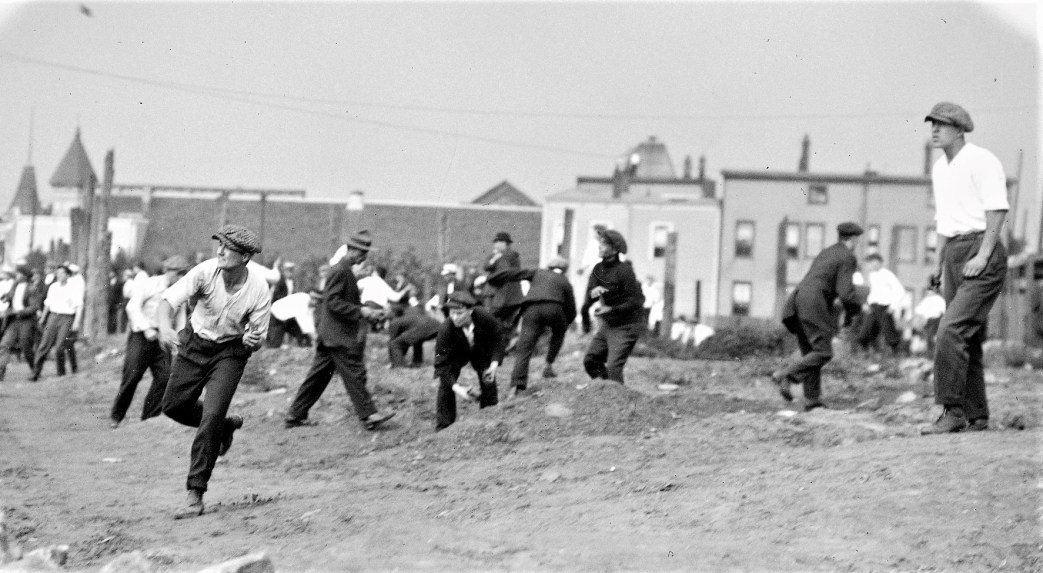 Outside, two single lines of bareheaded men, scarred veterans of gas barrages, bayonets and three days of rifle fire, shuffle slowly up narrow High Street, hugging close to opposite gutters. Banking the sidewalks ten tiers deep are their women and children, mainly swarthy, high-cheeked Poles. A single policeman, a pot-bellied old fellow with a warty neck, leads the procession. Only in the distance are there other cops and they are directing traffic. Today, police avoid this dismal slum.