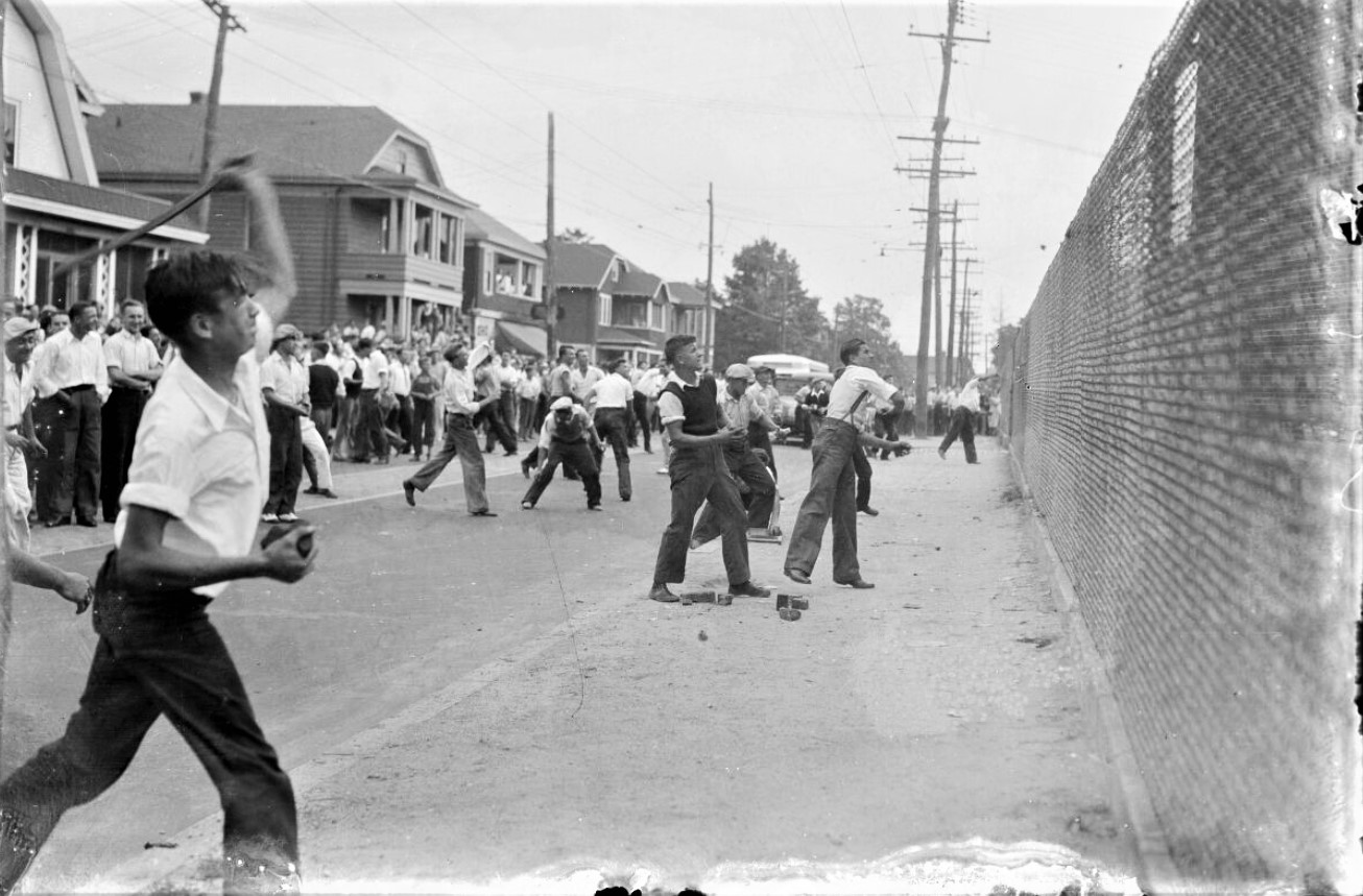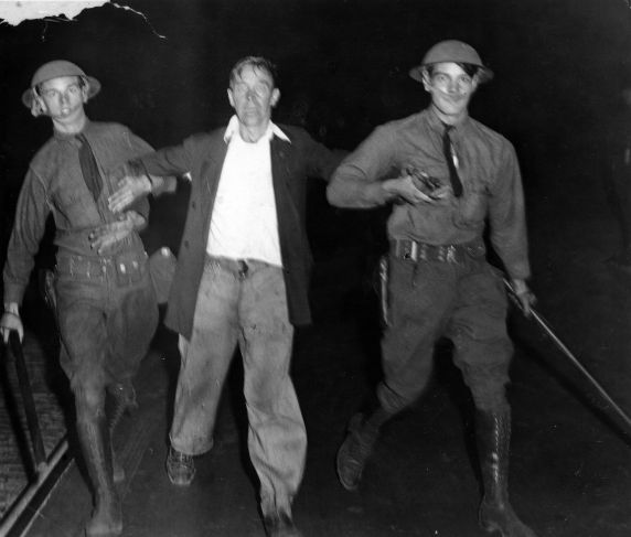 Under cover of darkness the workers advance on three fronts, stoning more street lights. Guardsmen send up illuminating flares, followed by gas bombs. In one sally, the workers seize twelve grenades. Shortly before midnight, 50 Guardsmen charge down Lonsdale Avenue but scamper back from a rock barrage. Although gas fumes reach the Woodlawn district, a mile away, workers hold possession of the graveyard until dawn when the Guardsmen’s ranks swell to 1,300. Wednesday morning only 200 scabs show up.