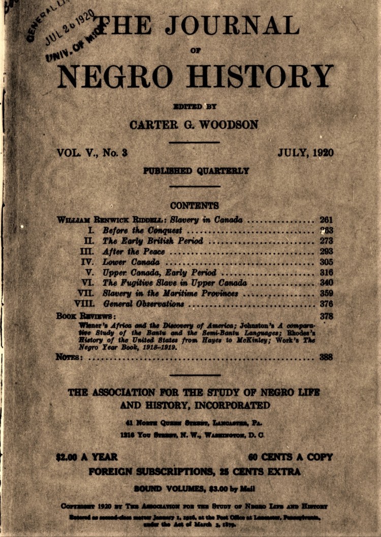 Contents: Slavery in Canada by Wim Renwick Ruppet: Before the Conquest, The Early British Period, After the Peace, Lower Canada, Upper Canada, Early Period, The Fugitive Slave in Upper Canada, Slavery in the Maritime Provinces, General Observations, Book Reviews: Wiener’s Africa and the Discovery of America; Johnston’s A comparative Study of the Bantu and the Semi-Bantu Languages; Rhodes’s History of the United States from Hayes to McKinley; Work’s The Negro Year Book, 1918-1919.