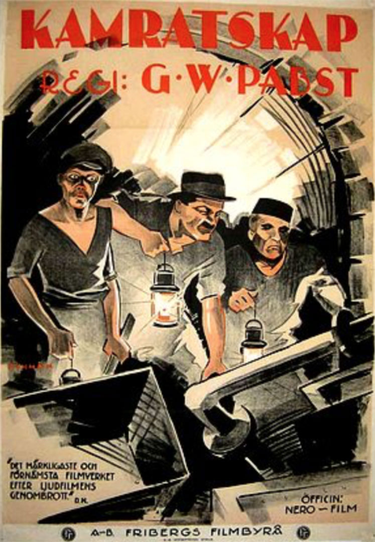 In 1906 French miners were entombed at Courrieres on the Franco-German border. The Germans came to their rescue. That event of class-solidarity is the core of Comradeship. But with correct insight into the political import of the event, Pabst and his scenarist Vajda project the occurrence into post-war Europe, 1919…A fire has been raging in the French sector of the mine. French Courrieres is encased in the ominousness of that fire…Three German miners visit a cafe in the French town. One of them asks a girl for a dance. She refuses. He says the Germans are as good dancers as the French. Threatening faces collect. The Germans leave. “Why did you refuse to dance with him?” asks the girl’s sweetheart. “I’m tired,” she answers…Into the French sector the miners go, also the fire-fighters. The girl leaves for Paris; she cannot endure the doom immanent village…A grandfather fearfully escorts little Georges to his first decent into the dragon’s mouth…The mine caves in. The girl leaps from the train at the next village, returns to her home. Her brother and lover are among the fire-fighters. The village assails the mine-gates.