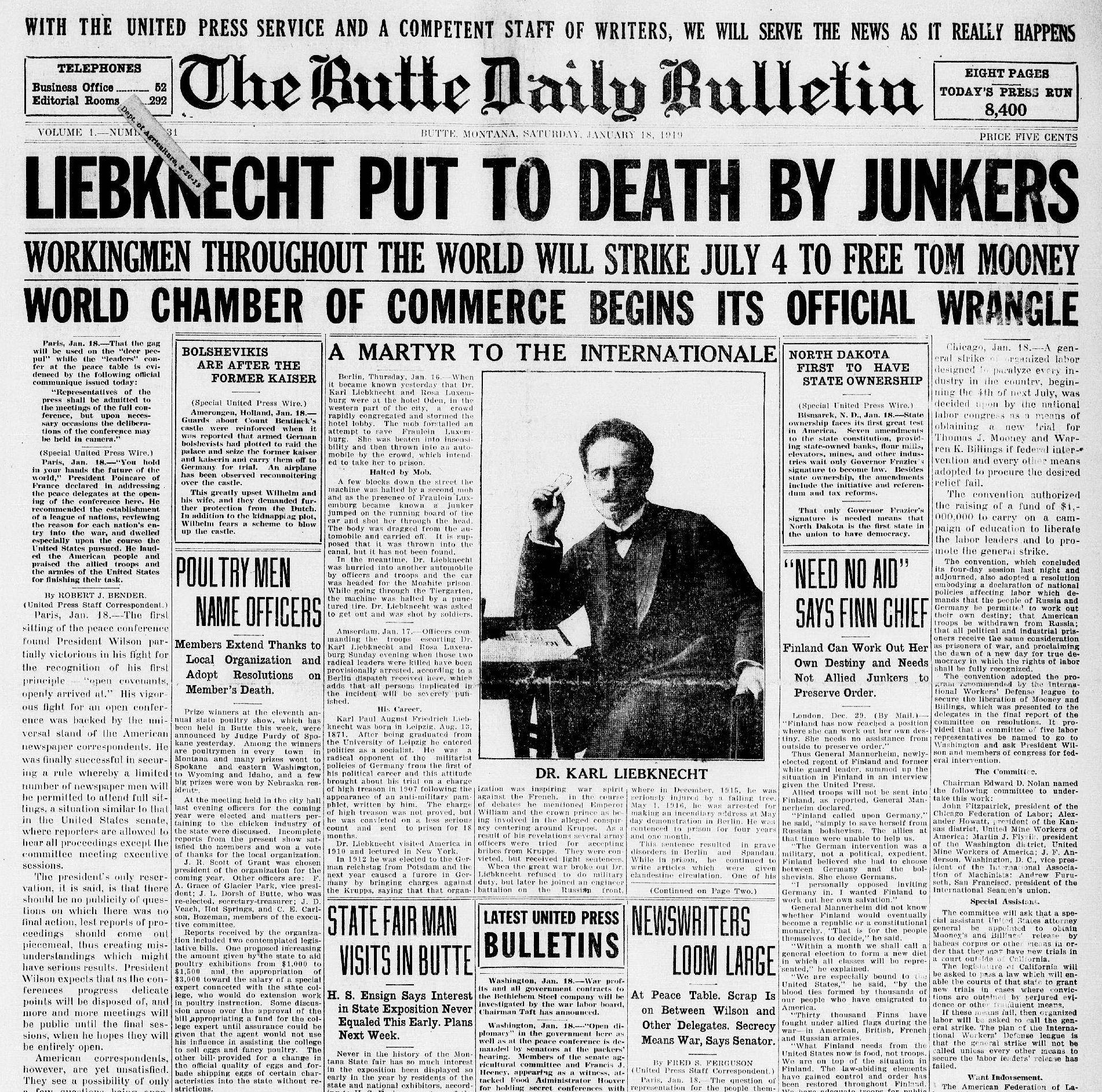 The Butte Daily Bulletin began in 1917 in reaction to the labor wars in Montana, the Speculator Mine fire killing 168 miners; IWW organizing, and the murder of IWW organizer Frank Little in Butte. Future Communist leader and IWW organizer William F. Dunne and R. Bruce Smith, president of the Butte Typographical Union published the paper as an outgrowth of a strike bulletin with the masthead reading, “We Preach the Class Struggle in the Interests of the Workers as a Class.” It became daily in August 1918 and in September 1818 officers raided their offices and arrested Dunne and Smith on sedition charges. An extremely combative revolutionary paper, while unaligned, it supported the struggles of the Left Wing in the SP, reflecting the large radical Irish working class of Butte also supported Ireland’s and the Bolshevik revolution, as well as the continued campaigns of the IWW locally and national as well as the issues in Butte. It ran until May 31, 1921.