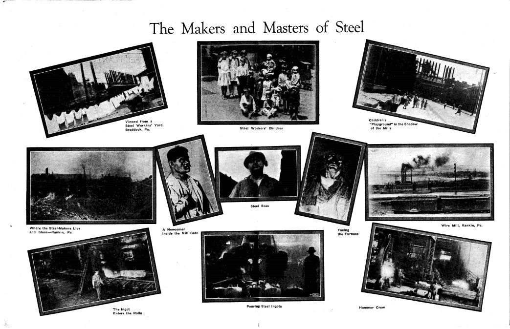 In the hearth of the Pittsburgh steel district, officially designated by the home boosters, “the work shop of the world” thousands upon thousands of steel workers live lives of hazardous grueling toil, mercilessly exploited by the strongest capitalist combine ever created, exposed to persecution if they dare to utter rebellious thoughts, sometimes dropping from complete exhaustion and picking themselves up to struggle along through their hopeless existence, finding relief only in an early grave.