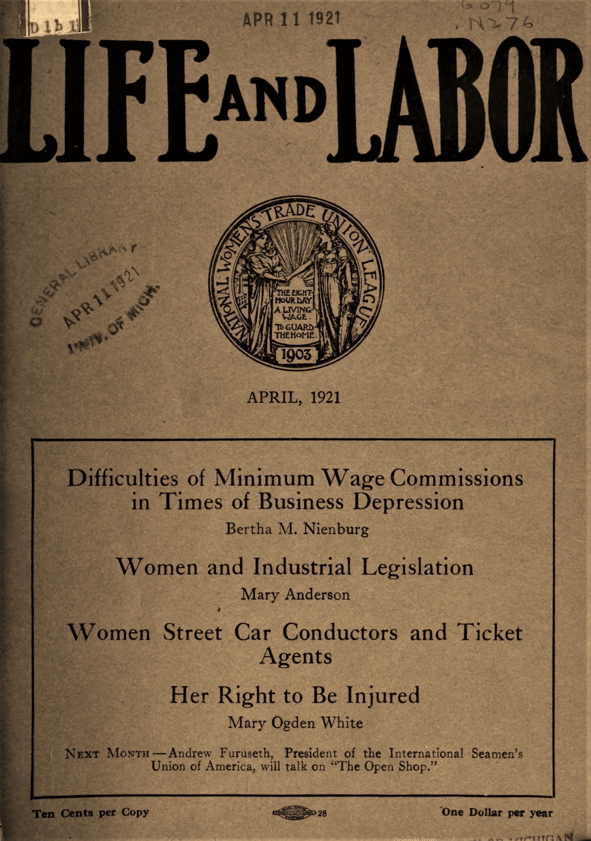 Life and Labor (National Women’s Trade Union League). Vol. 11 No. 4. April, 1921.