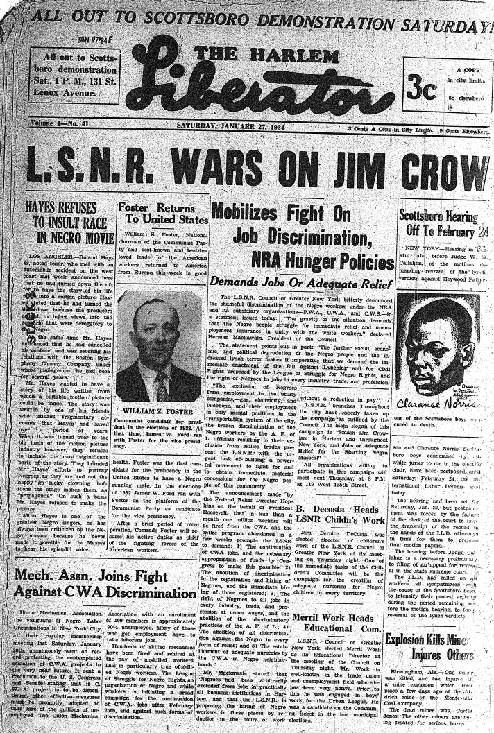 The Liberator was the paper of the League of Struggle for Negro Rights, largely edited by Benjamin Davis and begun in 1930. In 1932, its name changed to the Harlem Liberator, an again to the Negro Liberator before its run ended in 1935. The editorial board included William Patterson, James W Ford, Robert Minor, and Harry Haywood. Printed, mostly, every two weeks, The Liberator is an important record not only of radical Black politics in the early 1930s, but the ‘Harlem Renaissance’ as well. The successor to the American Negro Labor Congress, The League of Struggle for Negro Rights was organized by the Communist Party in 1930 with B.D. Amis as the LSNR’s first General Secretary, followed by Harry Haywood. Langston Hughes became its President in 1933. With the end of the Third Period and the beginning of the Popular Front, the League was closed and the CP focused on the National Negro Congress by 1935. The League supported the ‘Self-Determination for the Black Belt’ position of the Communist Party of the period and peaked at around 8000 members, with its strongest centers in Chicago and Harlem. The League was also an affiliate of the International Workers Order.