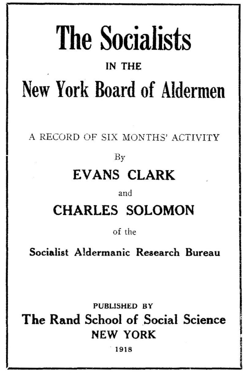 The Socialists in the New York Board of Aldermen: A Record of Six Months’ Activity by Evans Clark and Charles Solomon. Published by the Rand School of Social Science, New York. 1918.