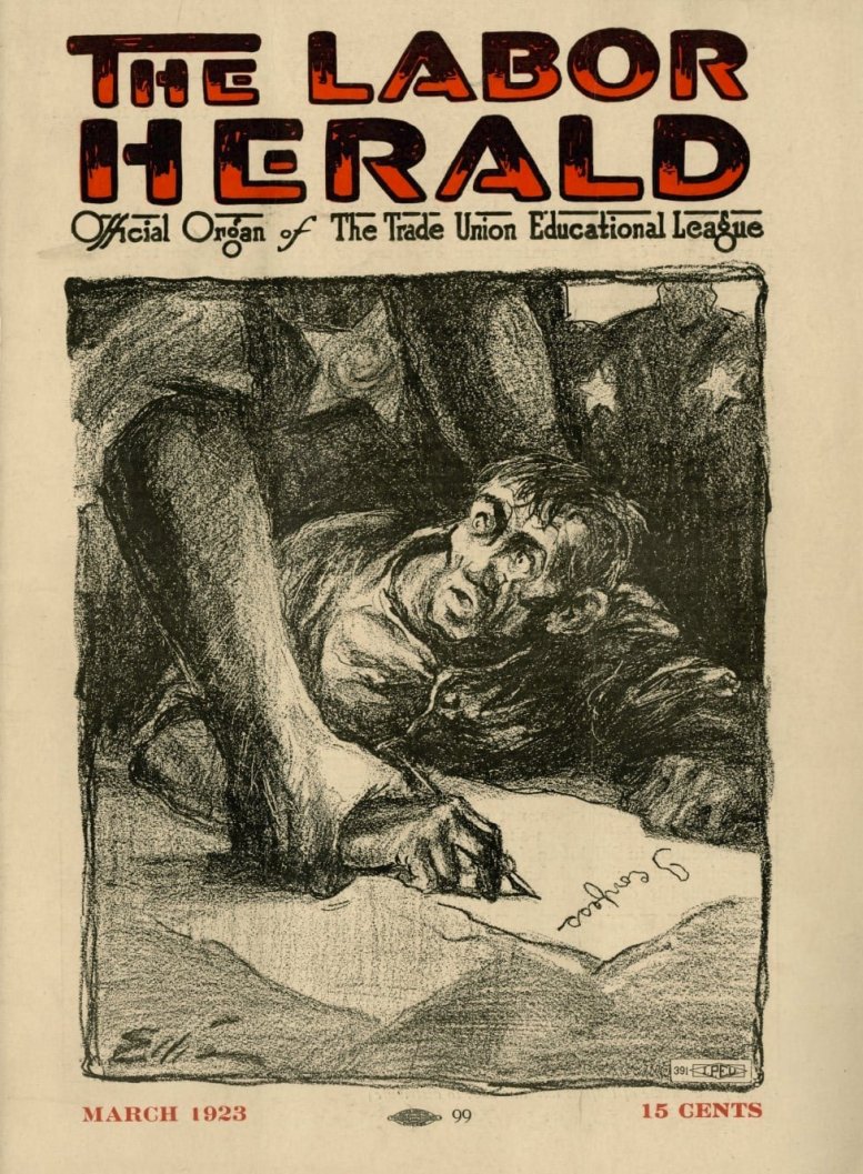 The Labor Herald was the monthly publication of the Trade Union Educational League (TUEL), in immensely important link between the IWW of the 1910s and the CIO of the 1930s. It was begun by veteran labor organizer and Communist leader William Z. Foster in 1920 as an attempt to unite militants within various unions while continuing the industrial unionism tradition of the IWW, though it was opposed to “dual unionism” and favored the formation of a Labor Party. Although it would become financially supported by the Communist International and Communist Party of America, it remained autonomous, was a network and not a membership organization, and included many radicals outside the Communist Party. In 1924 Labor Herald was folded into Workers Monthly, an explicitly Party organ and in 1927 ‘Labor Unity’ became the organ of a now CP dominated TUEL. In 1929 and the turn towards Red Unions in the Third Period, TUEL was wound up and replaced by the Trade Union Unity League, a section of the Red International of Labor Unions (Profitern) and continued to publish Labor Unity until 1935. Labor Herald remains an important labor-orientated journal by revolutionaries in US left history and would be referenced by activists, along with TUEL, along after it’s heyday.