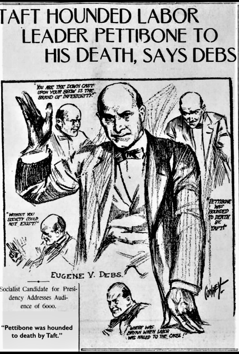 Pettibone first became prominently identified with organized labor at the time of the Couer d’Alene strikes, which were broken up by the intervention of federal troops. As one of the leaders he was arrested and sentenced to jail, serving several months. From this time forward he was actively engaged in organizing the Western Federation of Miners, of which he was one of the pioneers and an honored member up to the time of his death.