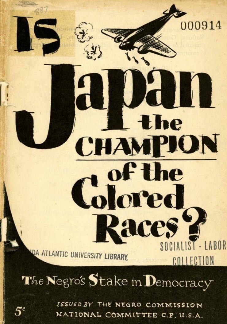 Written by Black CP leaders and intellectuals in 1938 to challenge the increasing popularity of Imperial Japan as a non-white counter to European and US imperialism among Black Americans and others in the late 1930s. The example of Japanese imperialism barbarous assault on China was central to this arguments. Largely written by Cyril Briggs after discussions through the Harlem Section of the Communist Party and Negro Commission of the National Committee. Other contributors include Theodore Bassett, AW Berry, James W Ford, and Harry Haywood.