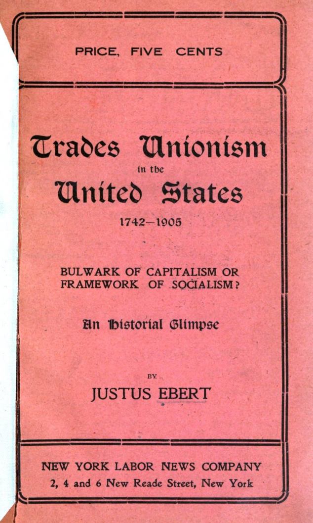 Trades Unionism in the United States 1742-1905: Bulwark of Capitalism or Framework of Socialism? An Historical Glimpse by Justus Ebert. New York Labor News Company, 1905.