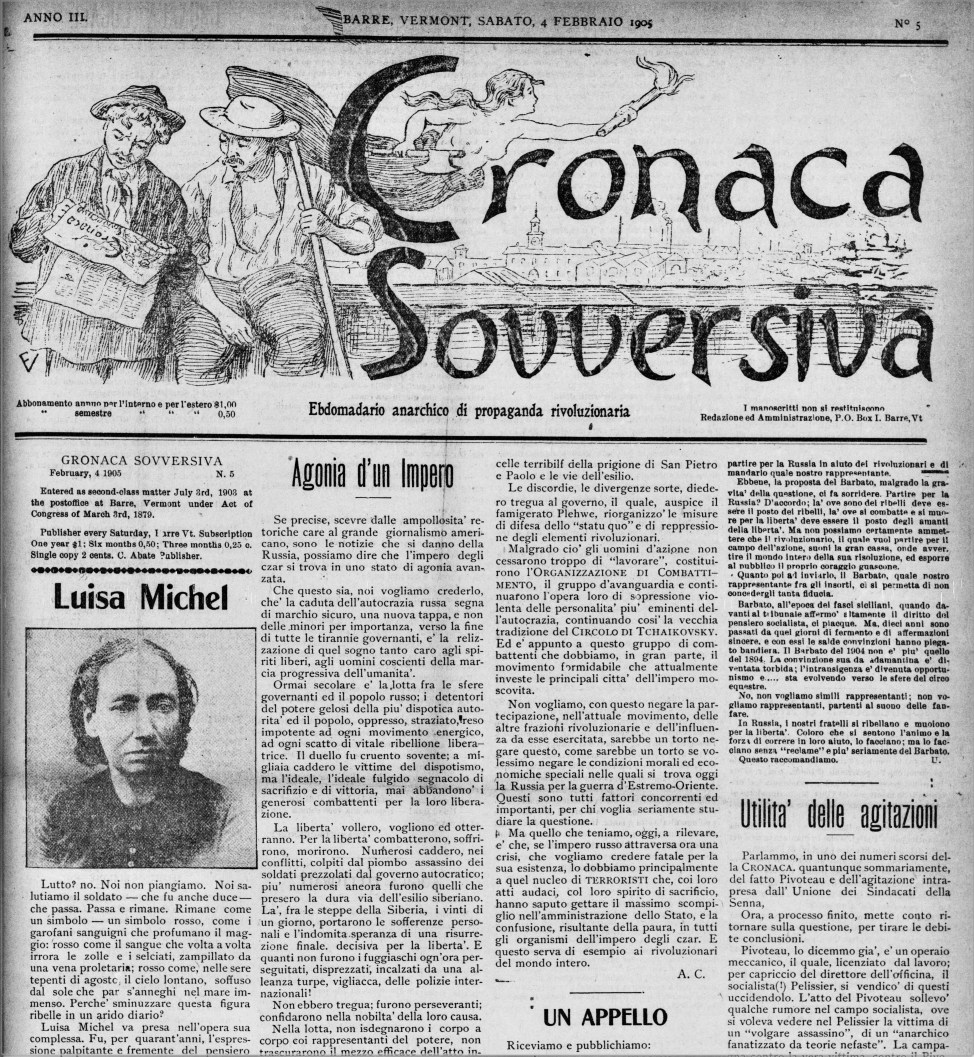 Cronaca Sovversiva (Subversive Chronicle) was an Italian-language paper edited by Luigi Galleani from 1903 to 1920, and one of the United State’s most important anarchist publications of its, or any, time. It was based among the radical Italian quarriers of Barre, Vermont. Luigi Galleani had been jailed for his revolutionary politics in Italy. Having escaped, he made his way to Paterson, New Jersey, a city Cronaca Sovversiva would have a long relationship with, by 1901. Shot during a riot and indicted in the 1902 Paterson silk strike he escaped, again, to Canada before changing his name and landing in Barre. Shortly after he began publishing from Vermont, but the paper was widely read in Italy, where it would be banned in 1915, and Italian-speaking radical America. Early associated with the ‘propaganda of the deed’ wing of anarchism, Galleani published bomb-making advice along with its labor coverage. Described by a federal agent as “the most rabid, seditious and anarchistic sheet ever published in this country,” the paper moved headquarters to Lynn, Massachusetts in 1912. There it would under constant watch and increasing raids by the authorities until the Postal Department rescinded its mailing privileges in 1917. Unlike many radical publications under such orders, Cronaca Sovversiva would continue, distributed by its own network moving production first to Washington DC in 1919 and then with Galleani’s deportation, to Turin, Italy in 1920. There the paper issued its last number. Imprisoned by the fascist authorities, then sent to internal exile on the Island of Lipari, Galleani died under house arrest in 1931 at age 70.
