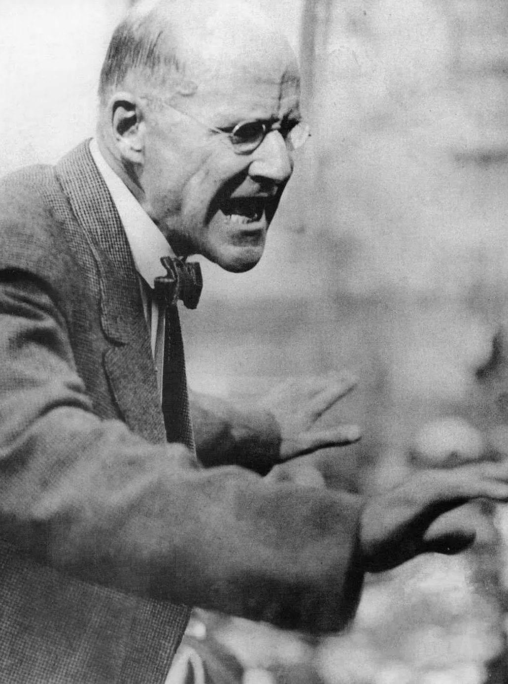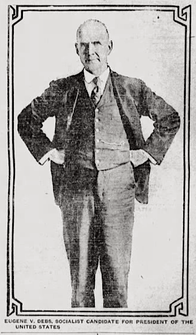 It was just 9:40 o’clock when a commotion at the rear of the stage made known the fact that Leader Debs had arrived after his uncomfortable and tedious trip through the freight yards of Boston. He pushed or rather was pushed through the group on the stage and in an instant his bald head, over-topping a light raincoat, could be seen making its way toward the desk. By this time the entire audience was on its feet and there was a wild demonstration.