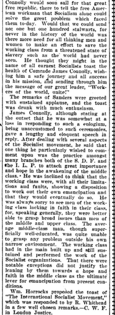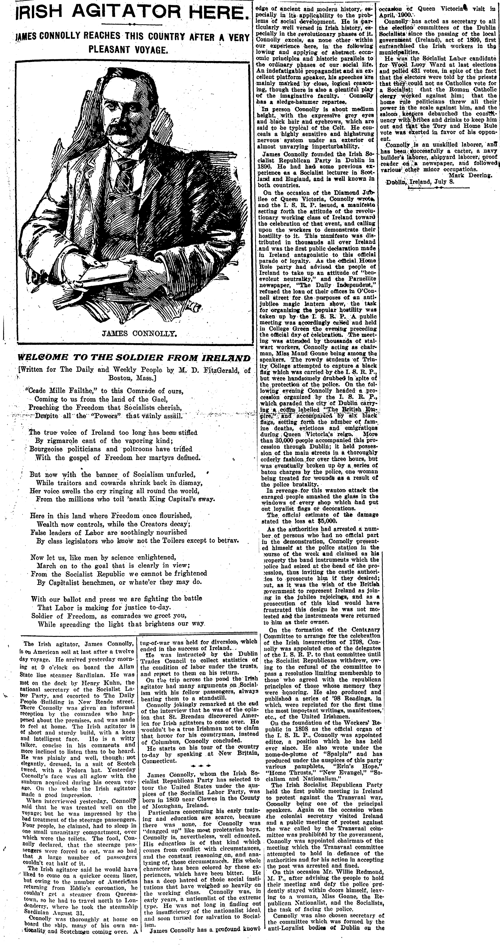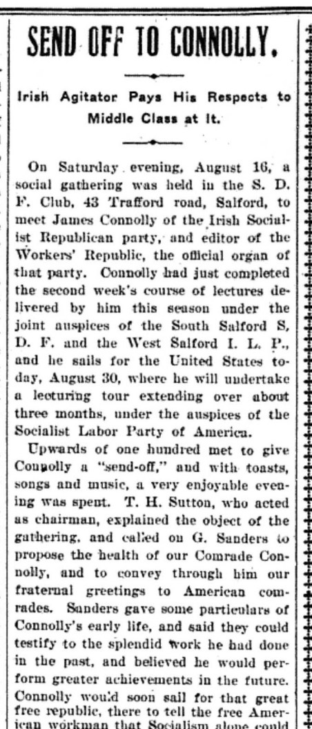 Connolly gets a send off as his boat leaves on August 30th for the United States from England, where he had just completed two weeks lecturing to the Social Democratic Federation and the Independent Labor Party of Salford.