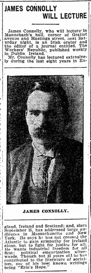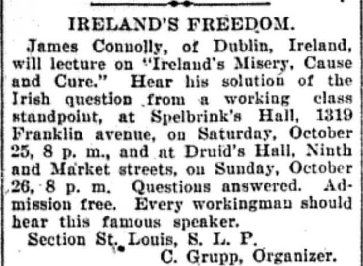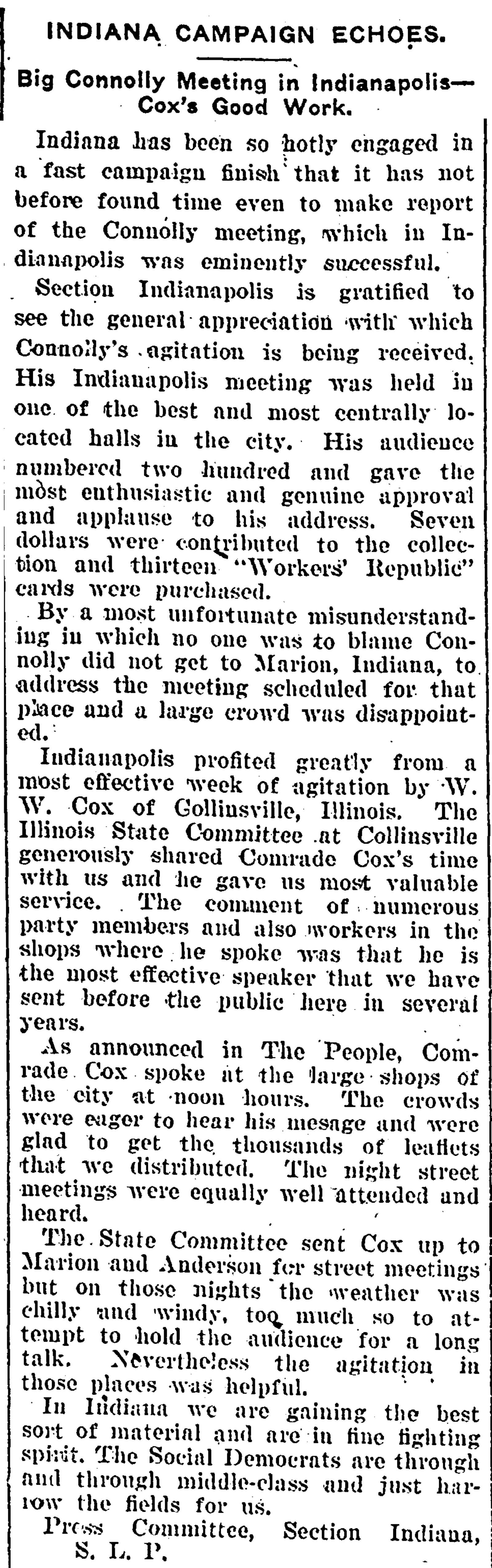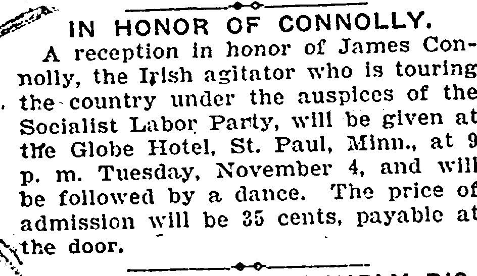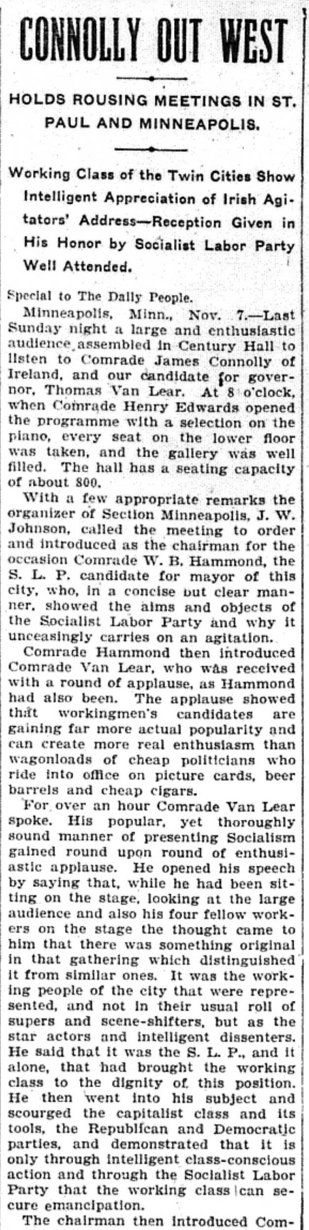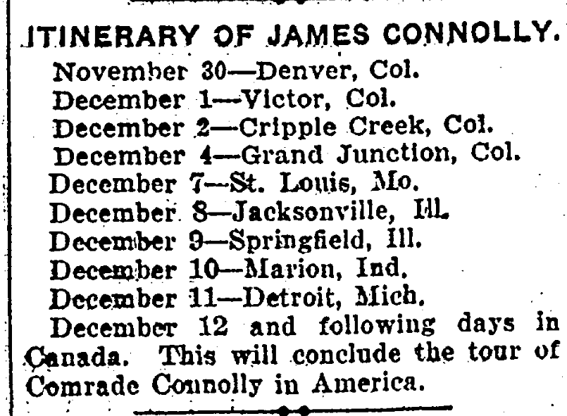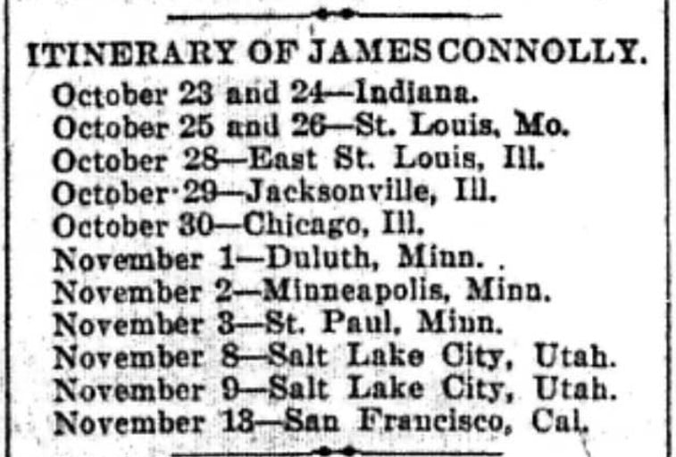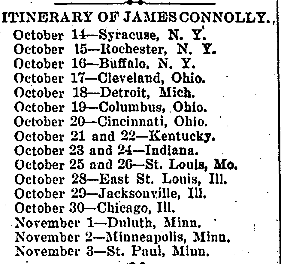 From Louisville, Connolly traveled through India into Illinois where he spoke at St. Louis, East St. Louis, Jacksonville, moving north to Chicago and the onto Minnesota speaking at Duluth and Minneapolis a week later.
