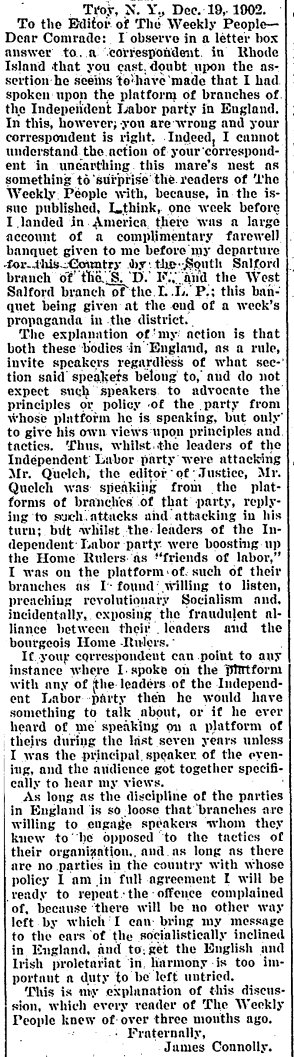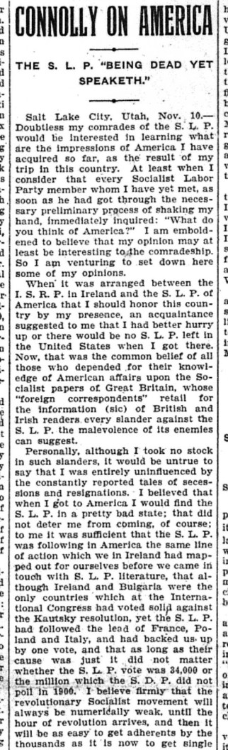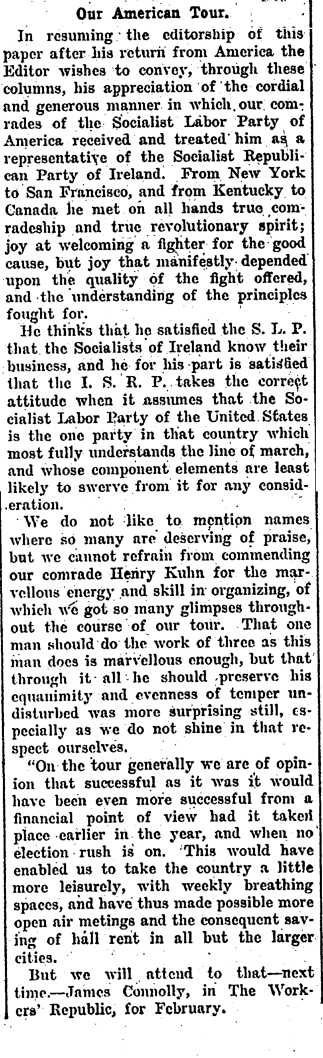 On his return to Ireland, Connolly wrote this letter of thanks to his S.L.P. hosts and offers some impressions of his tour.