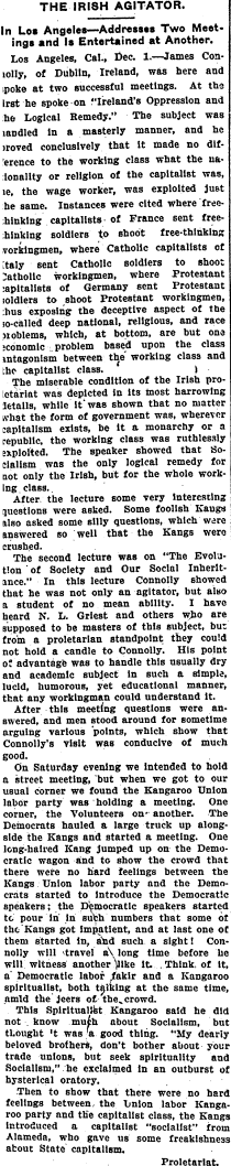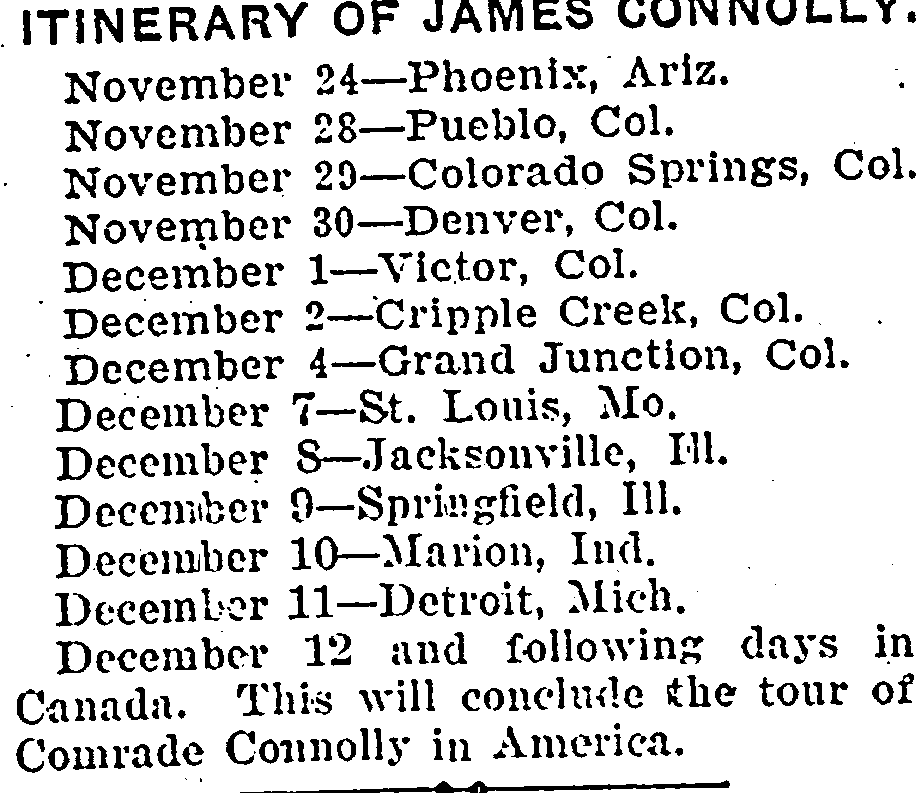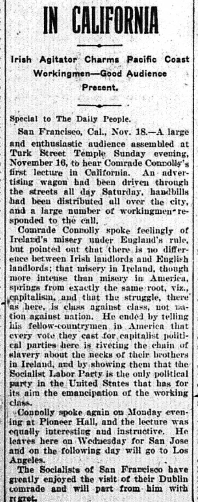 From the upper Midwest, Connolly traveled to Salt Lakes City, and then on to San Francisco where he arrived on November 18th and spoke at the Turk St. Temple and the Pioneer Hall. The popularity of the tour meant it was requested to extend all the way to Winnipeg. and then south in the the mining regions of the desert Southwest and Colorado areas.