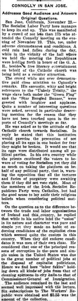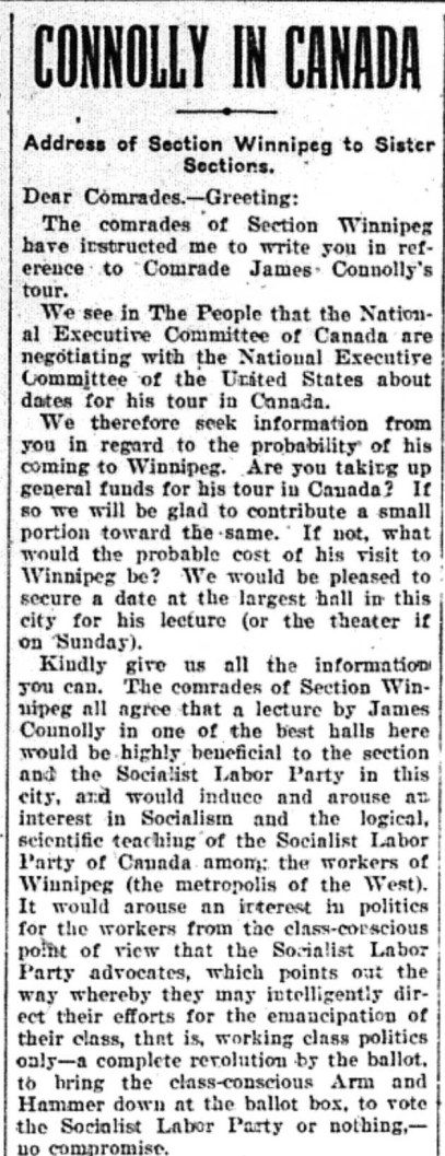 Reports from San Jose, where Connolly spoke to 175 comrades, and from Winnipeg requesting Connolly travel to Canada to speak there.