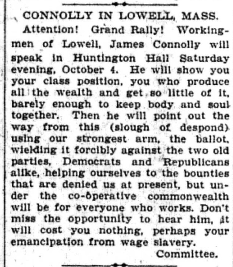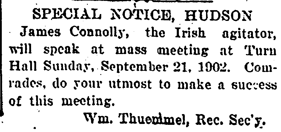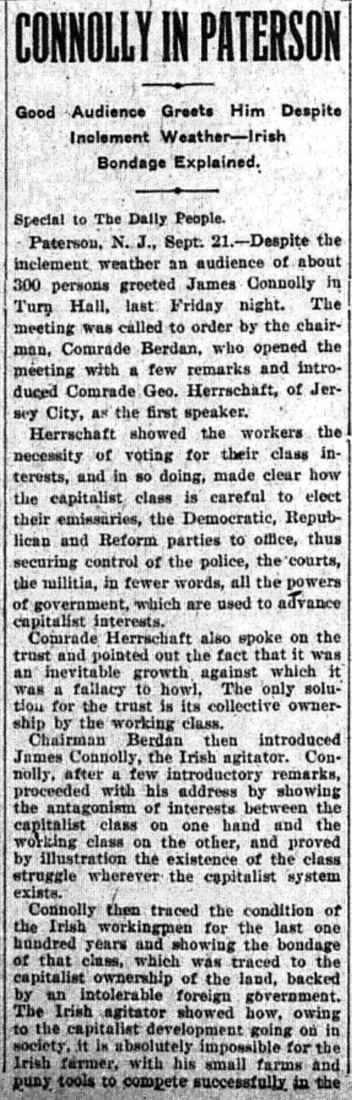 The next reports of James Connolly on his Socialist Labor Party-sponsored Autumn 1902 speaking tour across the United States are from Patterson, New Jersey where he spoke to 300 people at Turn Hall on September 19th. As well, an announcement of his talk in Lowell, Massachusetts for October 4th at Huntington Hall and a reminder for comrades to hawk the Irish Socialist Republican Party’s ‘Workers Republic’ newspaper at Connolly meetings.