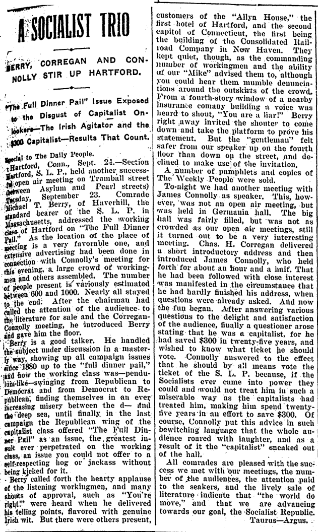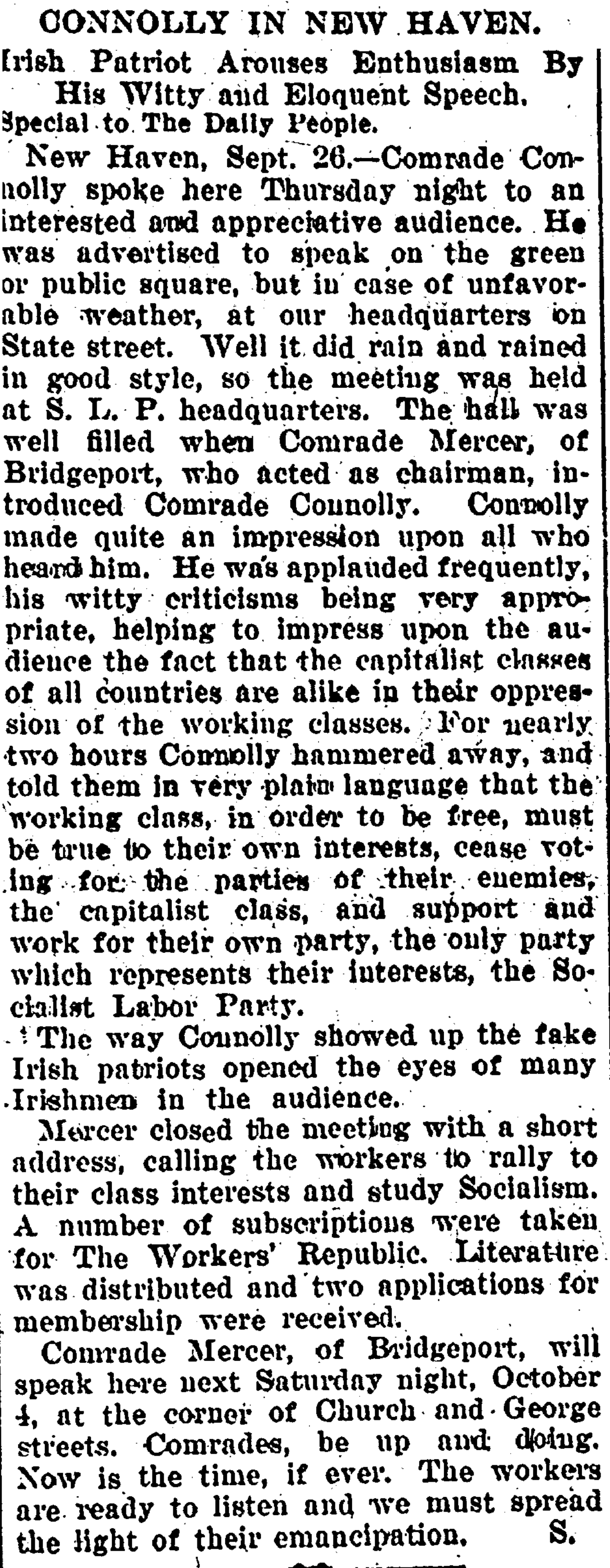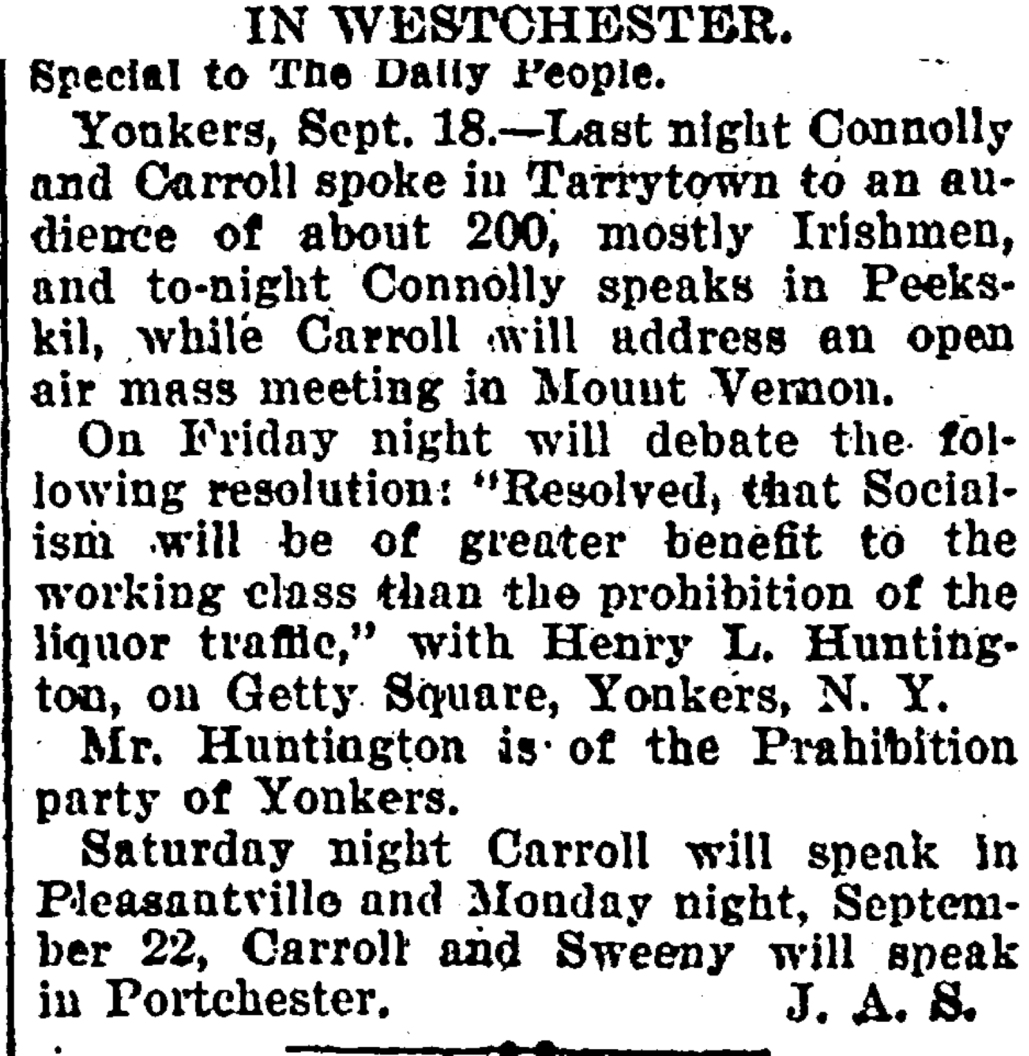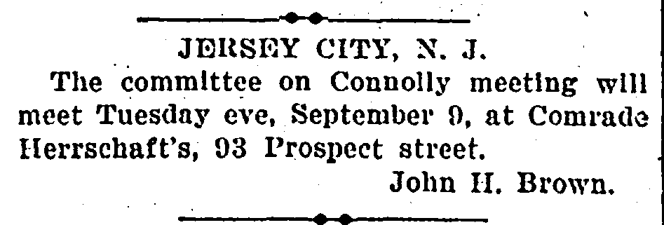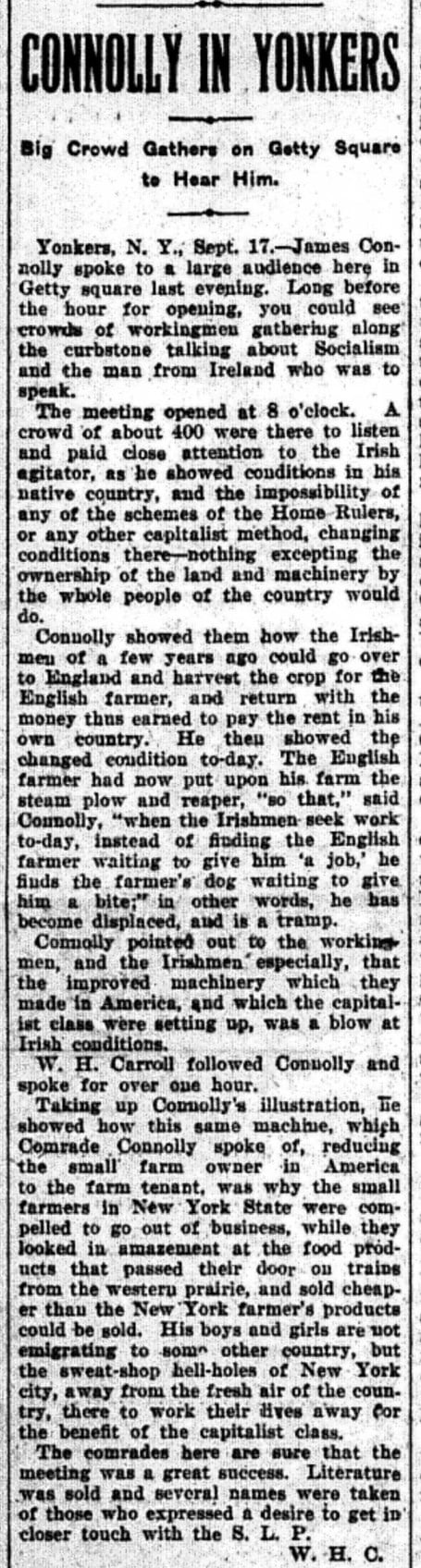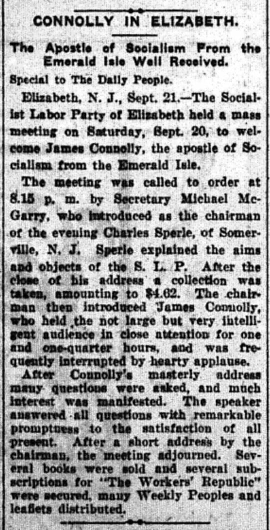 Continuing with James Connolly on his Socialist Labor Party-sponsored Autumn 1902 speaking tour across the United States. Beginning on the East Coast in New York City on September 15th, the Weekly People next carried reports of his stops in Yonkers, New York on the 17th of September and Elizabeth, New Jersey on September 20th.
