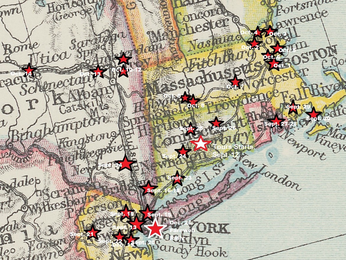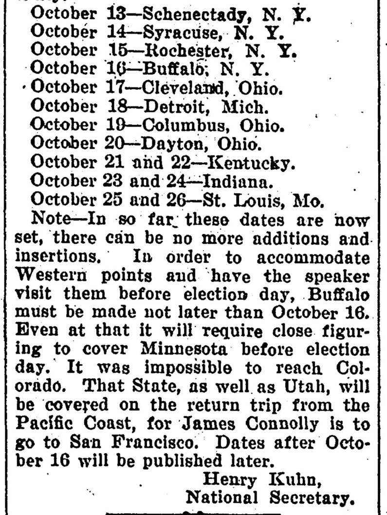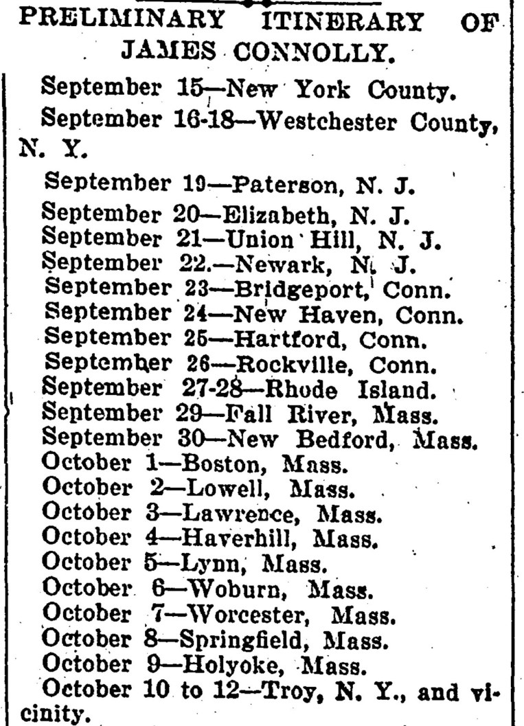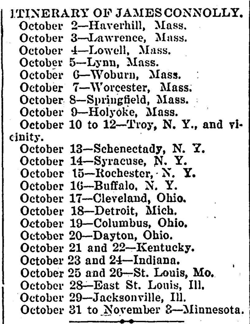 Preliminary itinerary of James Connolly’s 1902 US speaking tour for the Socialist Labor Party. The tours would be greatly expanded, running through late December when Connolly returns to the East Coast. Additional itineraries below.