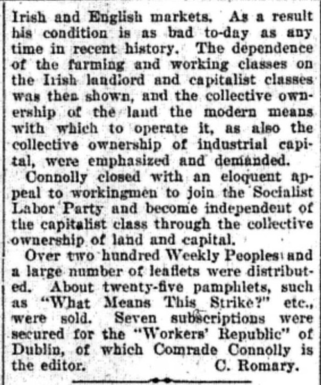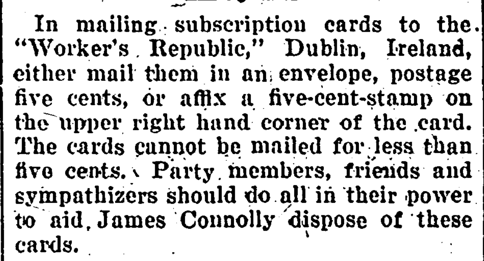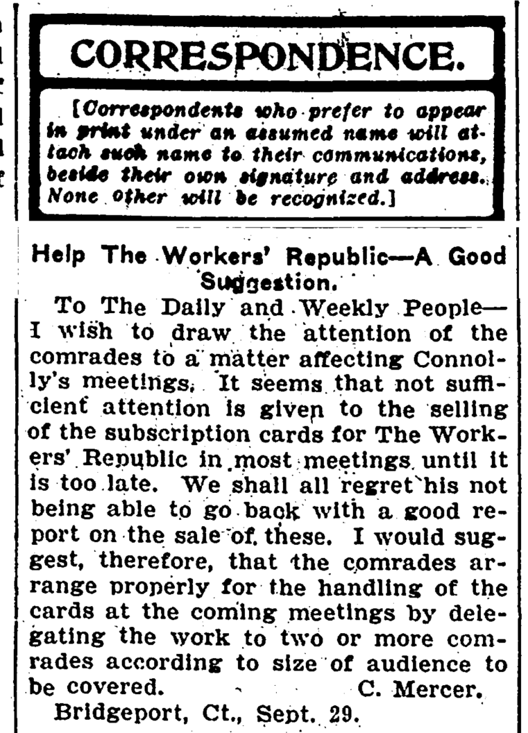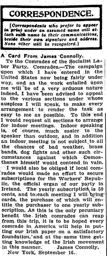 Traveling from New York in the northeast, reports of Connolly’s stops as Lowell, Hartford, New and Haven, as well as encouraging comrades to sell subs to Connolly’s Dublin ‘Workers’ Republic’ newspaper.