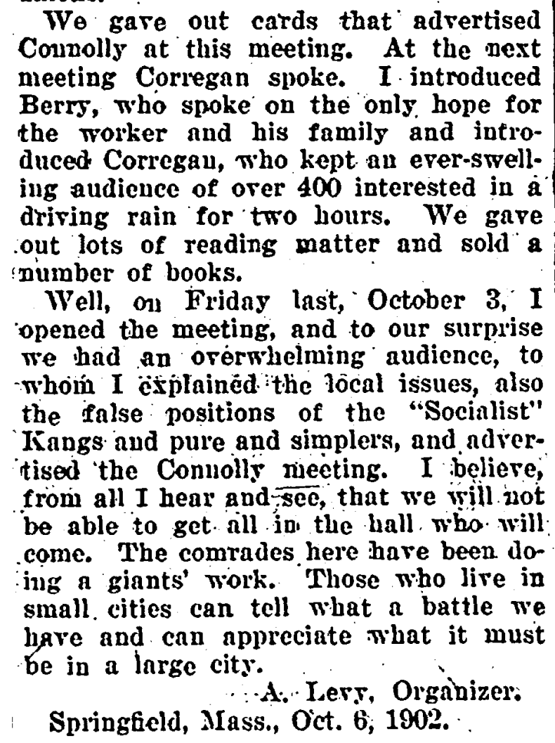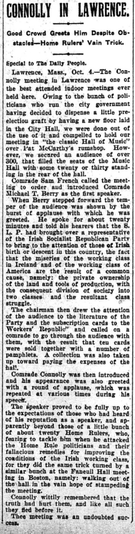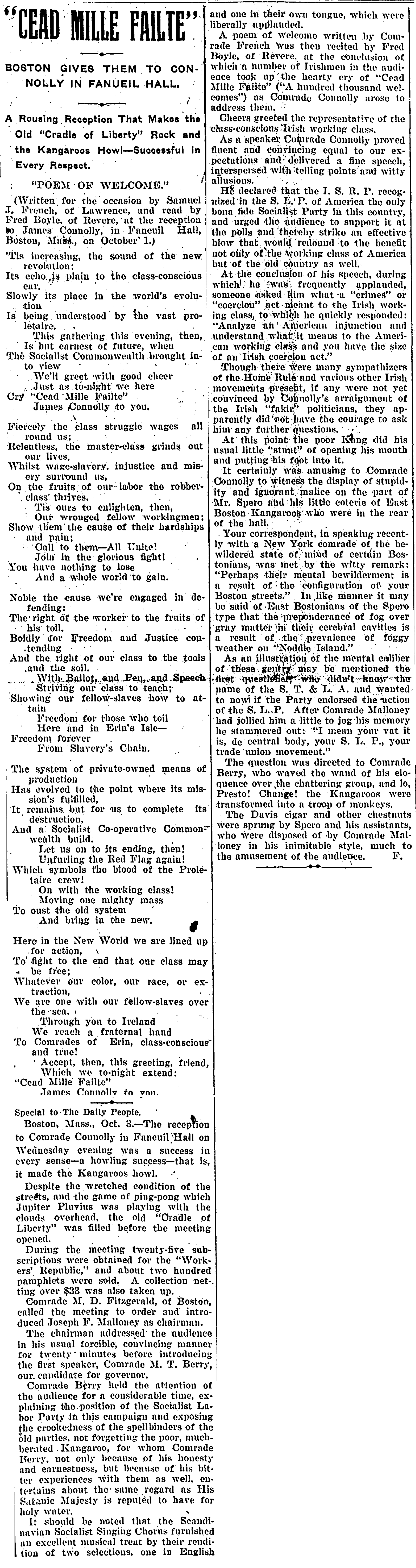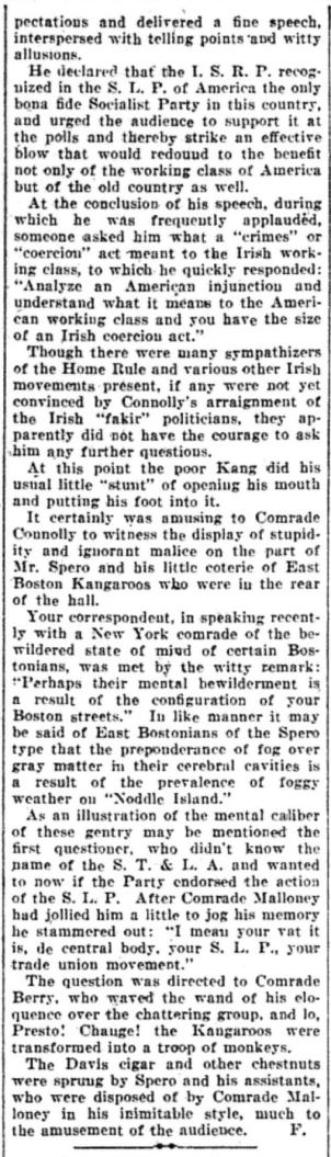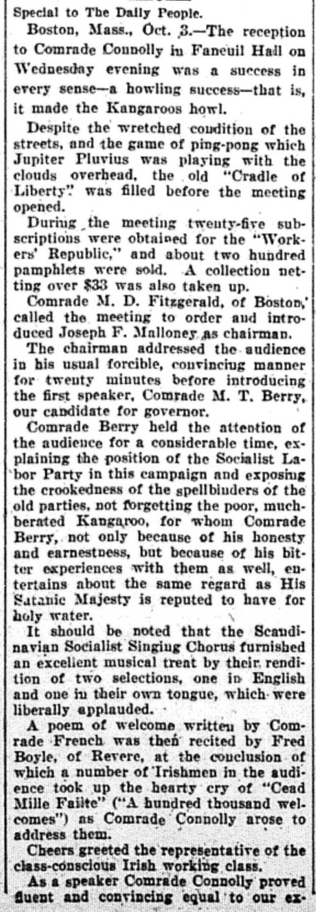 Continuing James Connolly’s 1902 speaking tour sees him leave the New York City area for Massachusetts. He spoke at Haverhill’s Washington Square on October 2nd, and the following evening spoke to a packed Faneuil Hall in Boston where $33 dollars was raised for the tour, 200 pamphlets and 25 subscriptions to ‘Workers Republic’ were sold. The ‘Kangaroos’ mentioned was a derogatory term by the De Leonistss for former dissidents in the SLP who would go on to form the Socialist Party. Connolly would become an SLP dissident within a year of the tour, and would join the ‘Kangs’ of the SP in 1908.