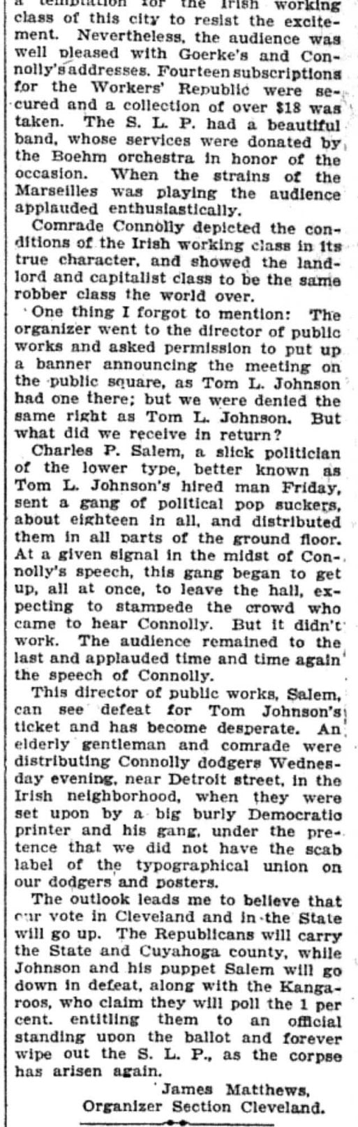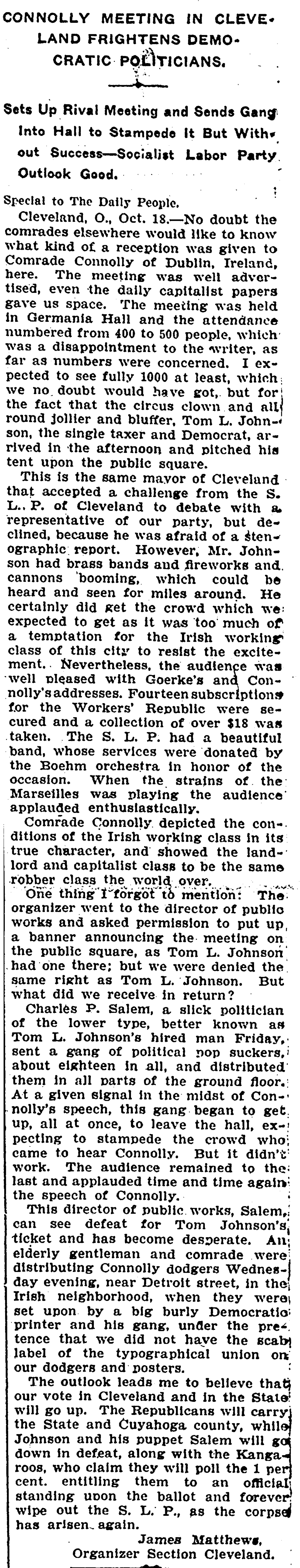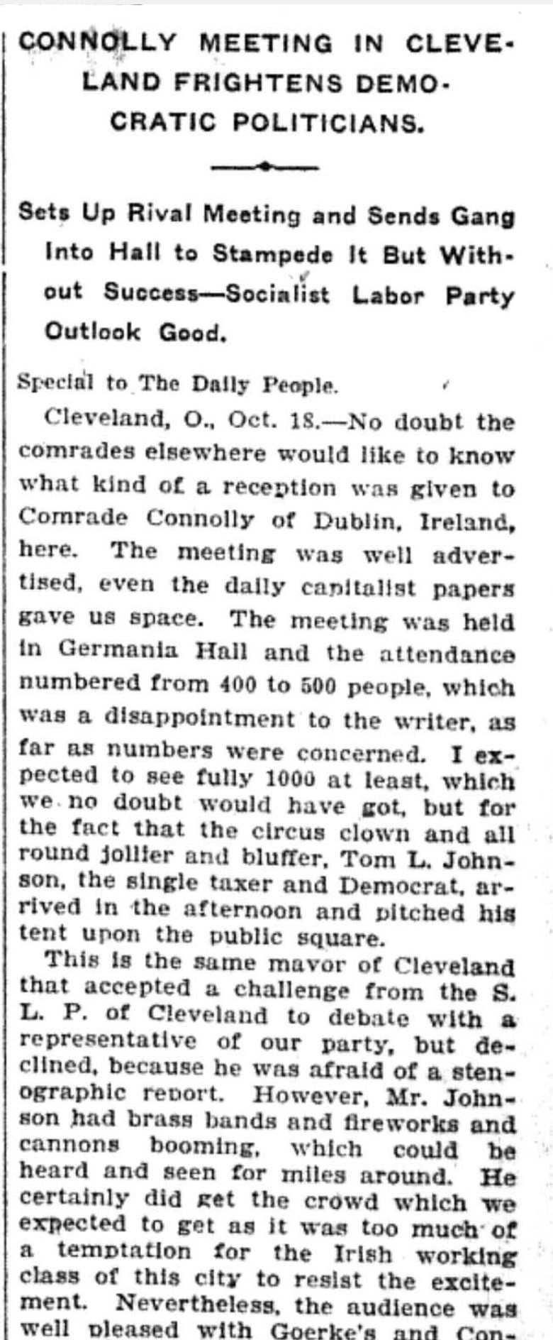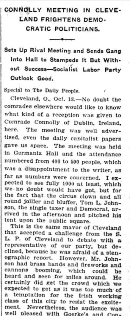 After his long stay in Massachusetts, James Connolly moved west across Upstate New York, speaking at Troy (to which he would later move), Schenectady, Syracuse, Rochester and Buffalo before speaking in Cleveland, Ohio on the 17th of October, 1902. There he spoke at Germania Hall to between 400 and 500 people, the organizers hoping for more but had competition from the Democratic Mayor of Cleveland’s nearby meeting with bands and fireworks. Nevertheless, the S.L.P. had their own band, the German Boehm Orchestra, that greeted Connolly to the tune of ‘La Marseillaise’. Fourteen subscriptions to ‘Workers Republic’ were sold and $18 raised for the tour. Also included is an updated itinerary for Connolly’s tour and an announcement of his October 26th address at St. Louis’ legendary Druid’s Hall.