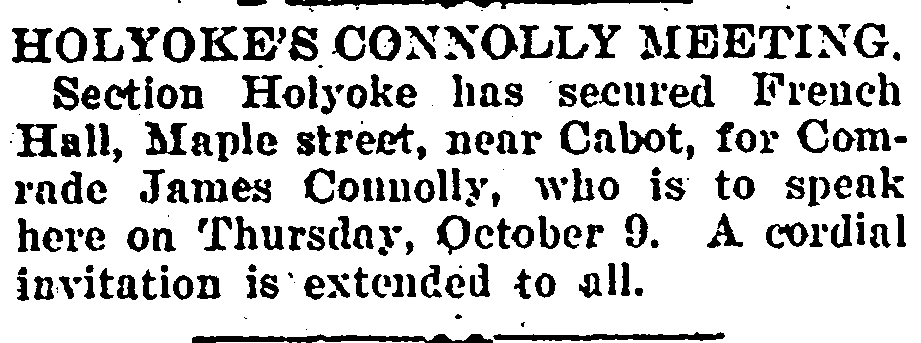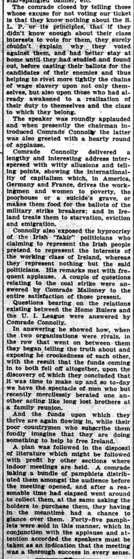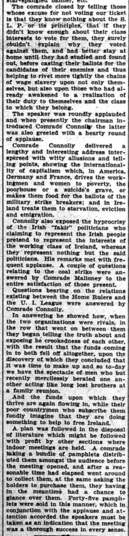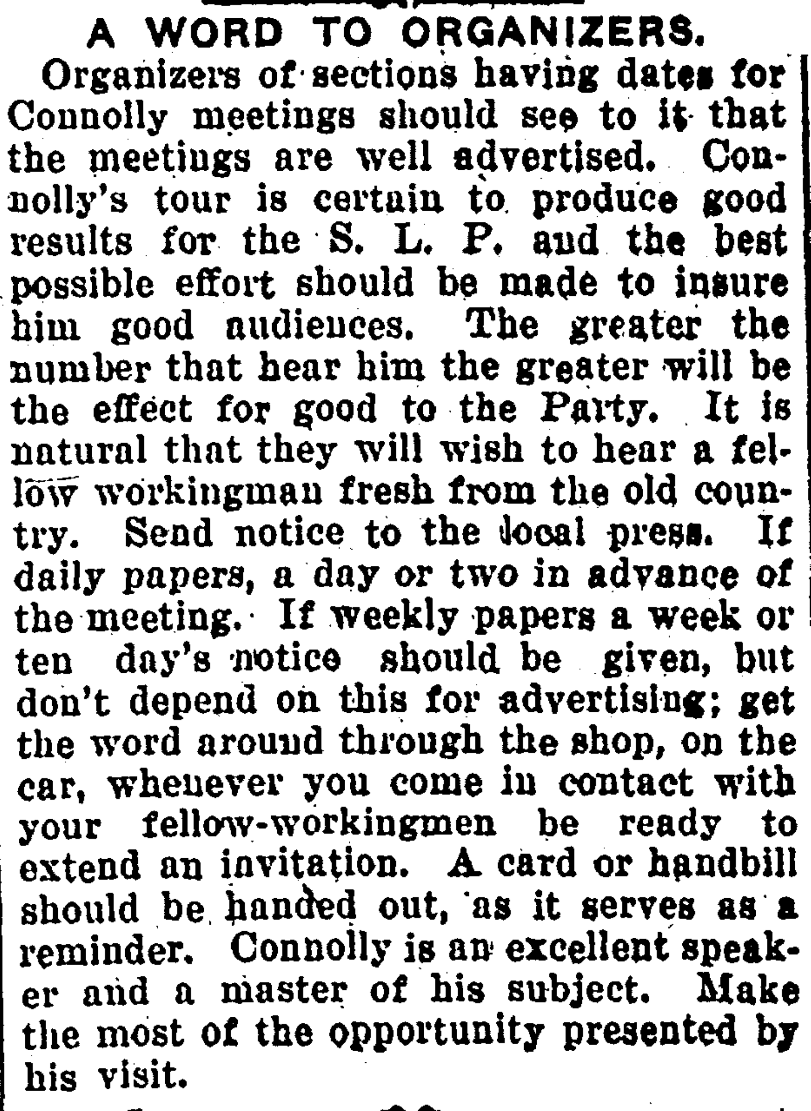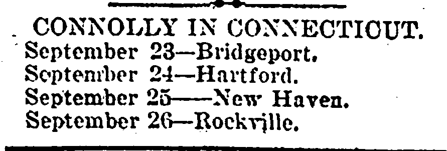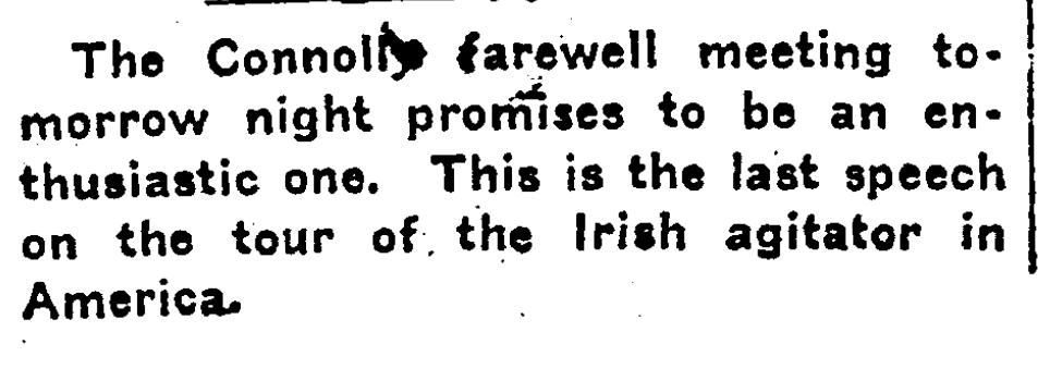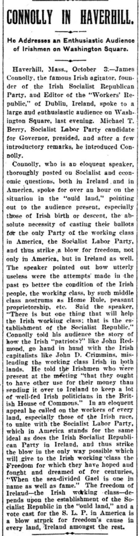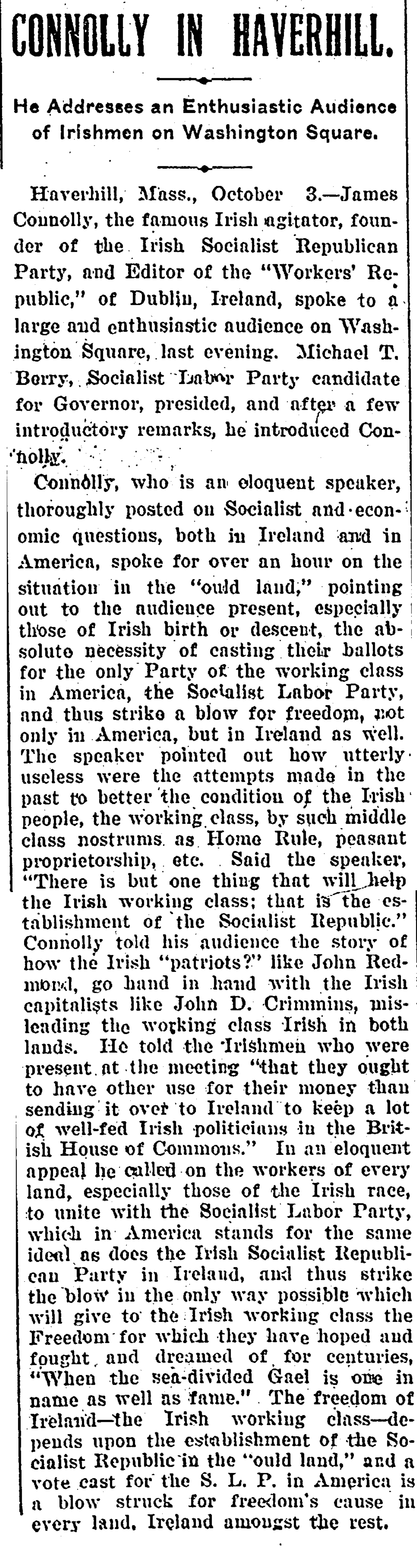 Still in the northwest, the reports are from Connolly’s talks in Wodburn, Springfield, and Boston, Lynn, and Haverhill and Columbus, Ohio announces their plans for Connolly’s upcoming visit..