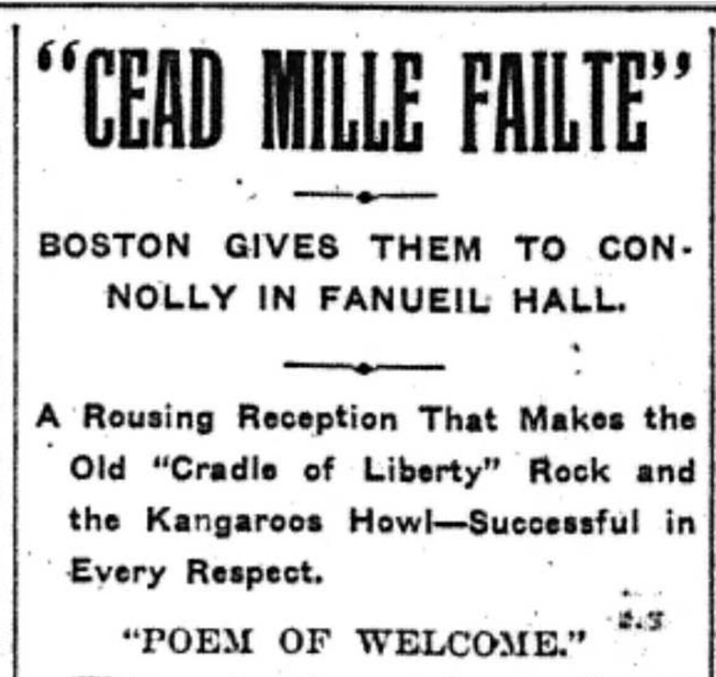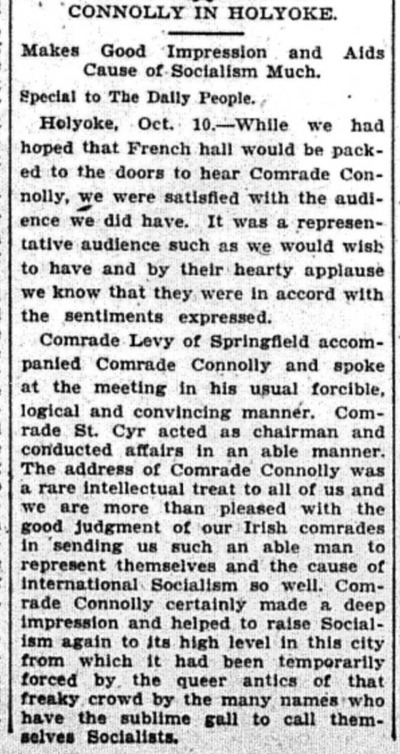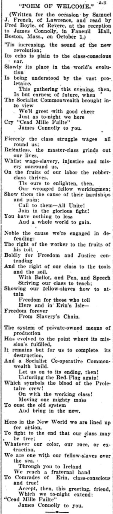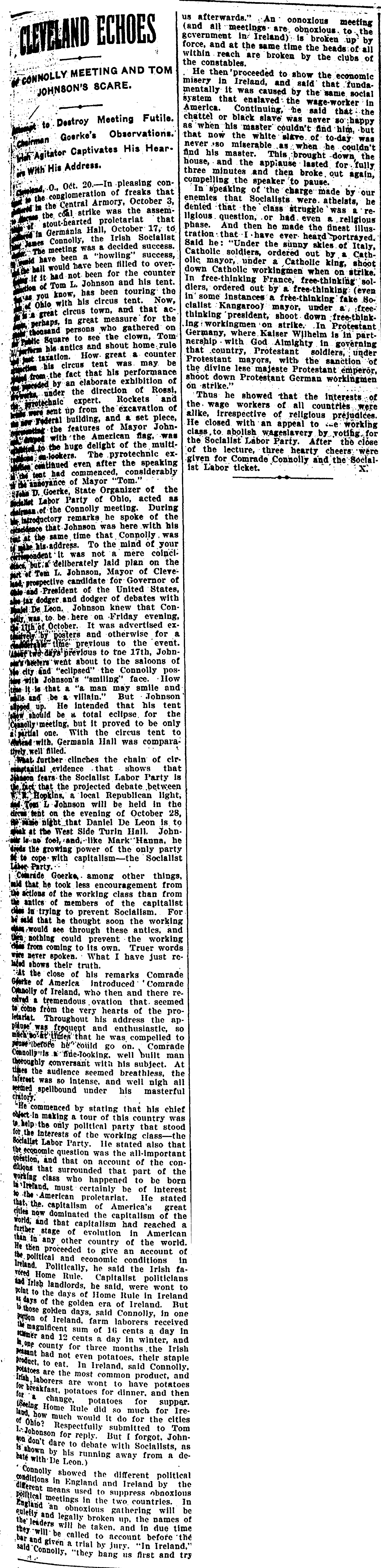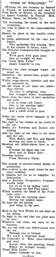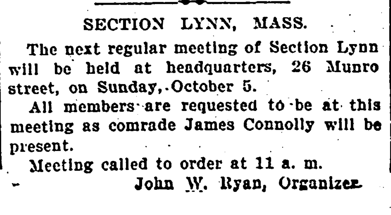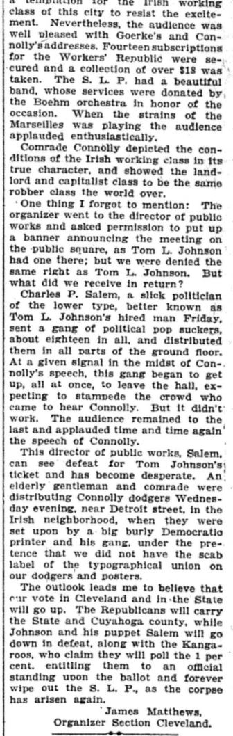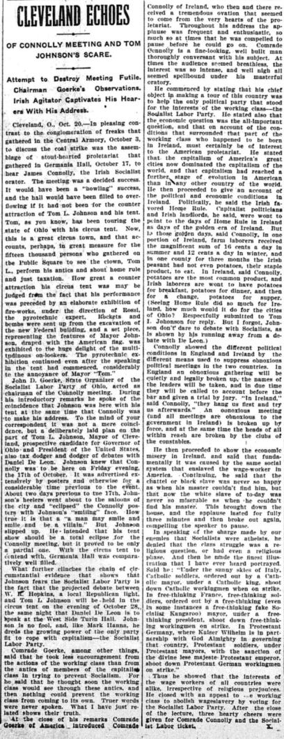 Still in the northwest, the reports are from Connolly’s talks in Wodburn, Springfield, and Boston, Lynn, and Haverhill and Columbus, Ohio announces their plans for Connolly’s upcoming visit..