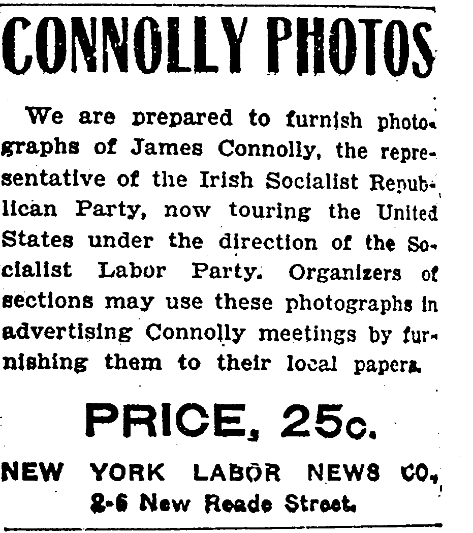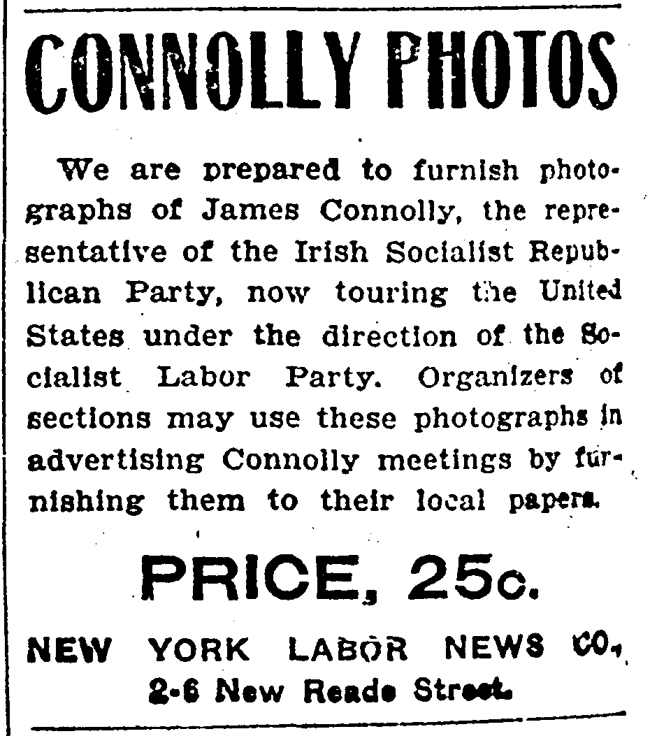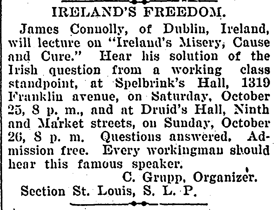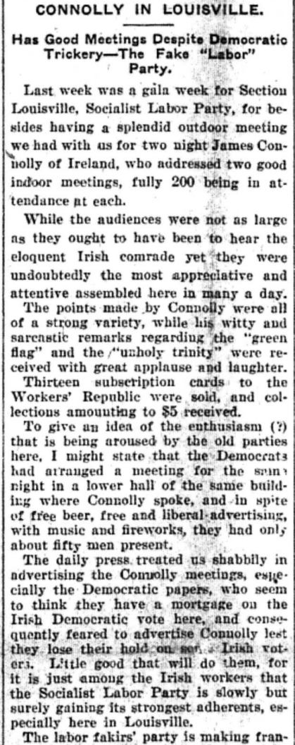 Connolly tours the Midwest. The editors must not have been happy with the previous, disappointed, report on Connolly’s October 18th talk in Cleveland, Ohio. The following issue contains a new report, this one more focused on Connolly’s talk that is altogether rosier. Also included is a report of the October 19th meeting in Columbus, Ohio at the city’s Odd Fellow’s Hall as 300 listeners heard Connolly’s ‘masterful oratory.’ The Columbus S.L.P. comrades claim to have distributed 5000 handbill and put up 500 posters for the event and sold seven subscriptions to ‘Workers’ Republic’ and many S.L.P. pamphlets. An article on Connolly’s two-night stay in Louisville, Kentucky where he spoke to 200 each night on October 21-22. Thirteen subscriptions to ‘Workers’ Republic’ were sold and $5 raised for the tour. A poem, ‘Erin’s Hope’, written by Mary McNabb Johnston after reading Connolly’s pamphlet of the same name was also printed. As were advertisements for 25 cent photos of Connolly and of the Irish Socialist Republican Party’s paper, ‘Workers’ Republic’. After Cleveland on the 17th, Connolly also spoke at Detroit on the 18th, in Columbus on the 18, and Cincinnati on the 20th before crossing the Ohio River for his Louisville, Kentucky talks on the 22st and 22nd of October.