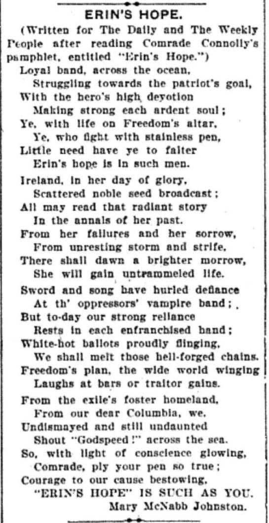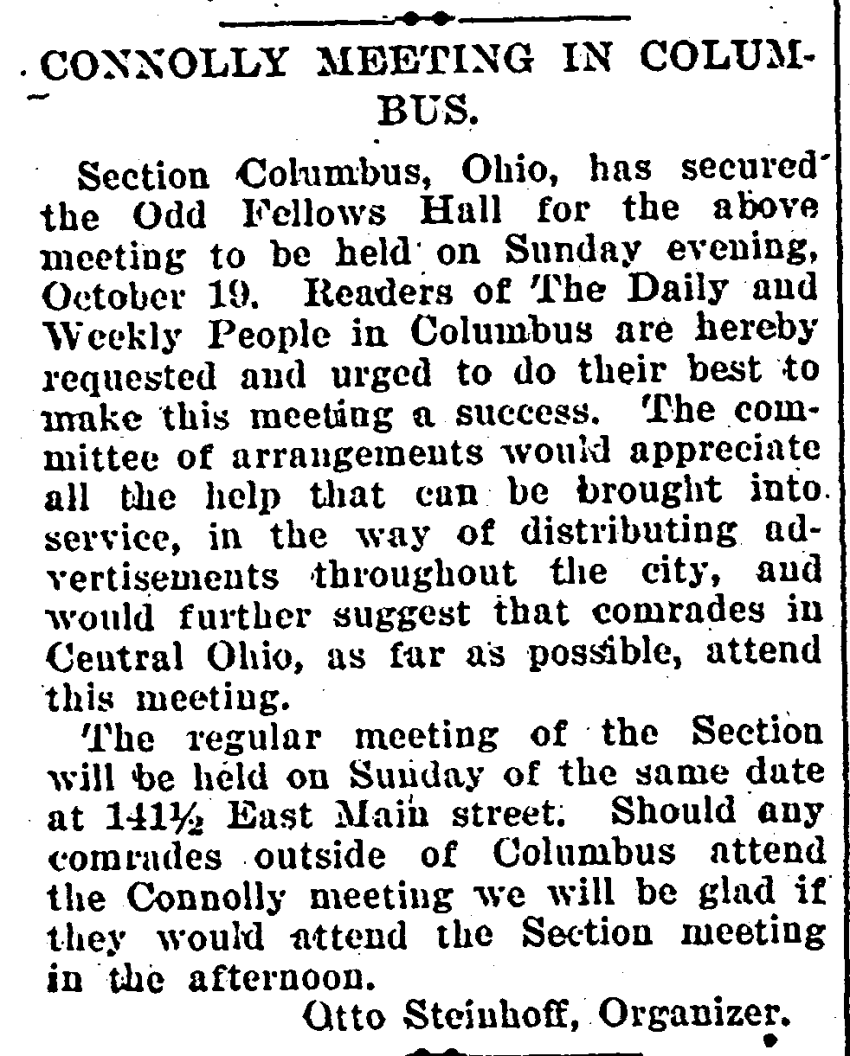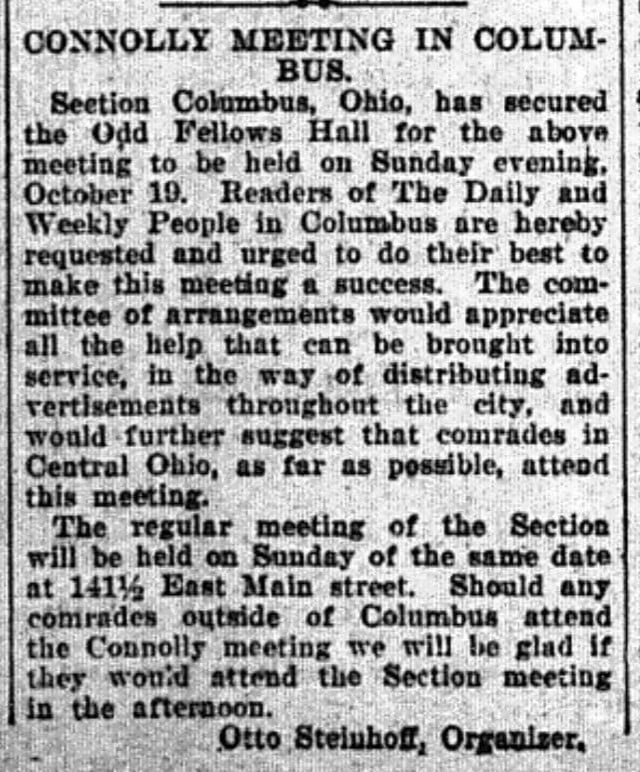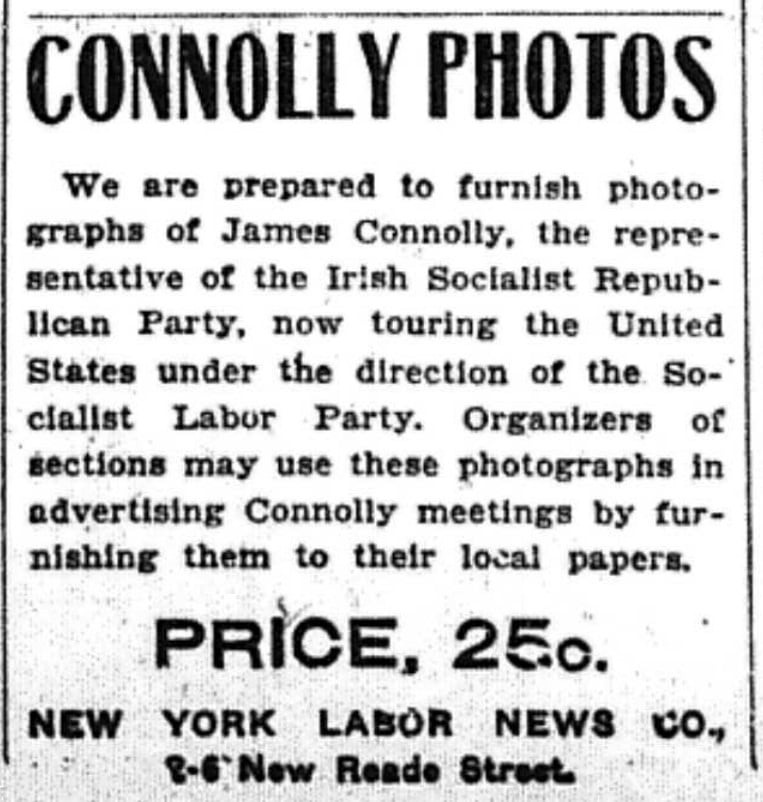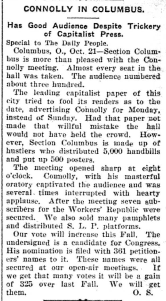 Connolly tours the Midwest. The editors must not have been happy with the previous, disappointed, report on Connolly’s October 18th talk in Cleveland, Ohio. The following issue contains a new report, this one more focused on Connolly’s talk that is altogether rosier. Also included is a report of the October 19th meeting in Columbus, Ohio at the city’s Odd Fellow’s Hall as 300 listeners heard Connolly’s ‘masterful oratory.’ The Columbus S.L.P. comrades claim to have distributed 5000 handbill and put up 500 posters for the event and sold seven subscriptions to ‘Workers’ Republic’ and many S.L.P. pamphlets. An article on Connolly’s two-night stay in Louisville, Kentucky where he spoke to 200 each night on October 21-22. Thirteen subscriptions to ‘Workers’ Republic’ were sold and $5 raised for the tour. A poem, ‘Erin’s Hope’, written by Mary McNabb Johnston after reading Connolly’s pamphlet of the same name was also printed. As were advertisements for 25 cent photos of Connolly and of the Irish Socialist Republican Party’s paper, ‘Workers’ Republic’. After Cleveland on the 17th, Connolly also spoke at Detroit on the 18th, in Columbus on the 18, and Cincinnati on the 20th before crossing the Ohio River for his Louisville, Kentucky talks on the 22st and 22nd of October.