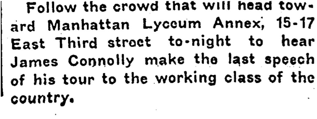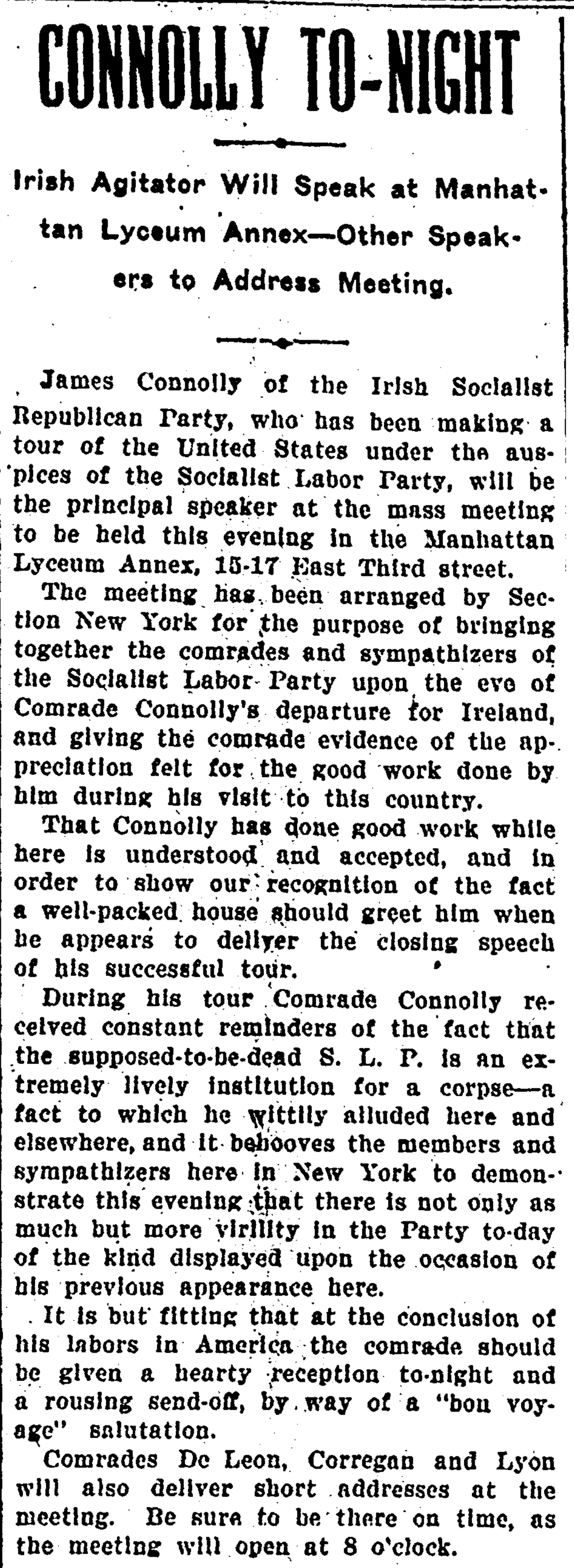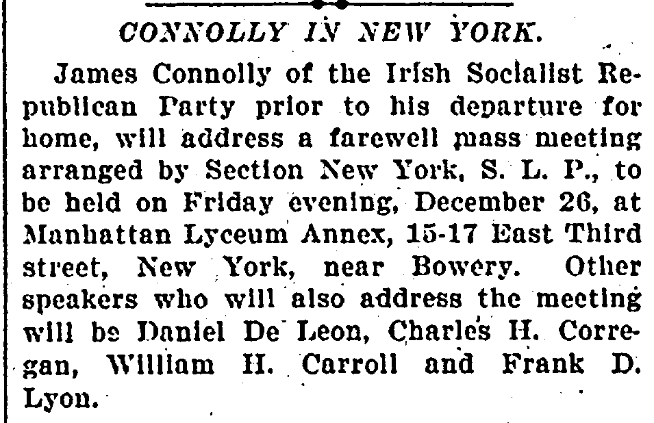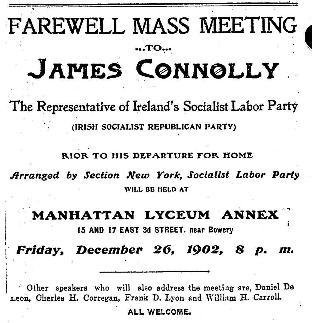 Saying Goodbye to James Connolly in New York City. James Connolly spent over three months in United States in 1902 as a guest of the Socialist Labor Party touring the country. Arriving on September, 15 he would speak in dozens of cities and towns across starting on the eastern seaboard, through the middle west to California, hitting places large and small in the mountain West, desert Southwest, and Great Lakes. After what can only be described as an exhaustive and successful string of engagements, Connolly to return to live in the U.S. the following year, the S.L.P. put on a grand event at the Manhattan Lyceum Annex in The Bowery on December 26, 1902 to wish him farewell, celebrate his and their success, and, as always, build the Party. For weeks beforehand the Daily People announced the event and its organizing. Here is a snapshot of that moment.