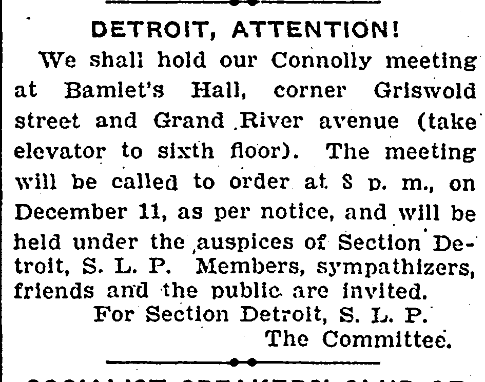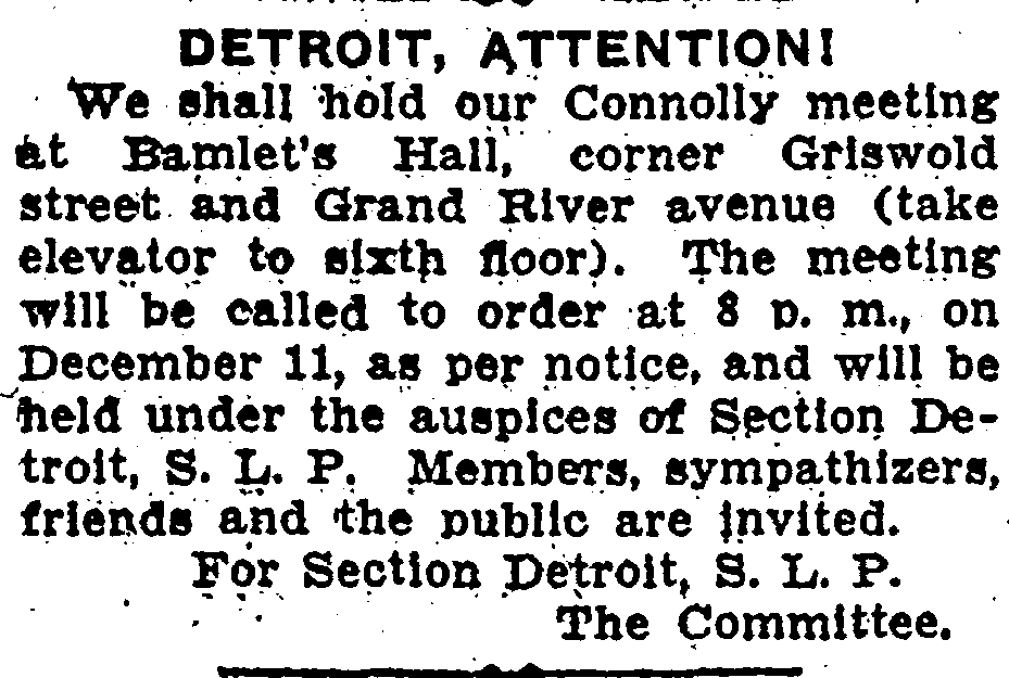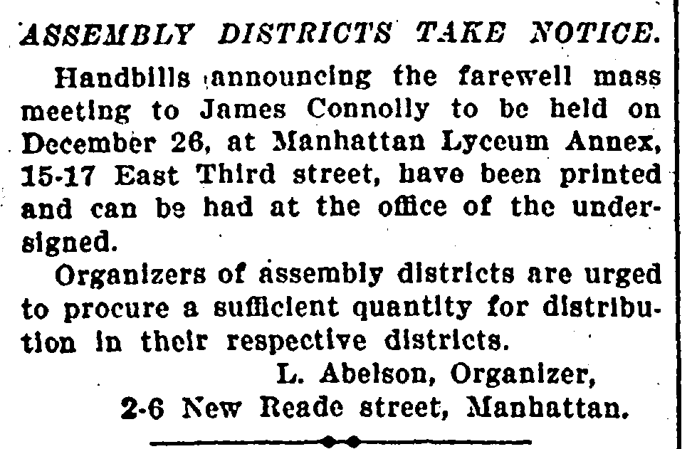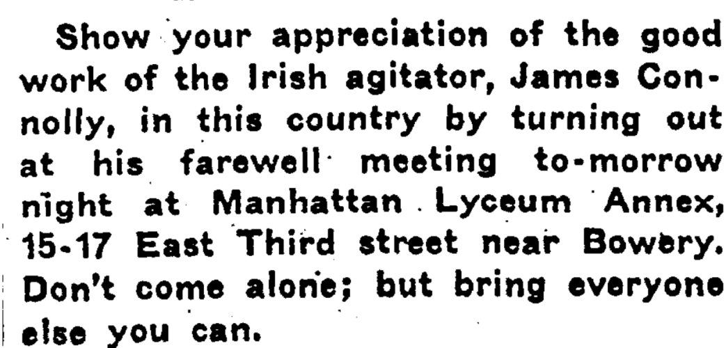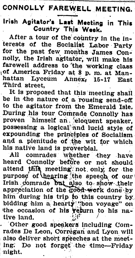 Saying Goodbye to James Connolly in New York City. James Connolly spent over three months in United States in 1902 as a guest of the Socialist Labor Party touring the country. Arriving on September, 15 he would speak in dozens of cities and towns across starting on the eastern seaboard, through the middle west to California, hitting places large and small in the mountain West, desert Southwest, and Great Lakes. After what can only be described as an exhaustive and successful string of engagements, Connolly to return to live in the U.S. the following year, the S.L.P. put on a grand event at the Manhattan Lyceum Annex in The Bowery on December 26, 1902 to wish him farewell, celebrate his and their success, and, as always, build the Party. For weeks beforehand the Daily People announced the event and its organizing. Here is a snapshot of that moment.