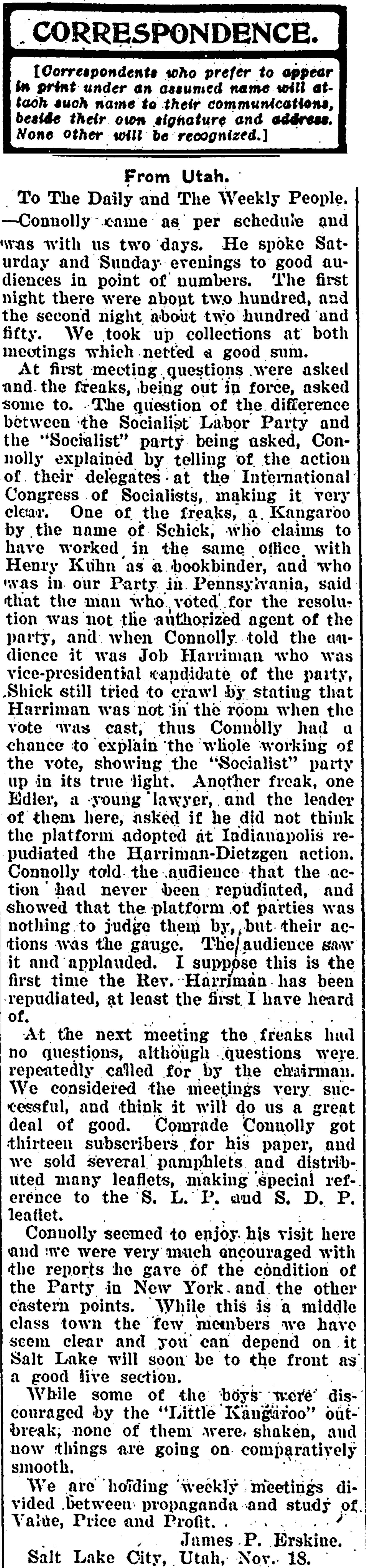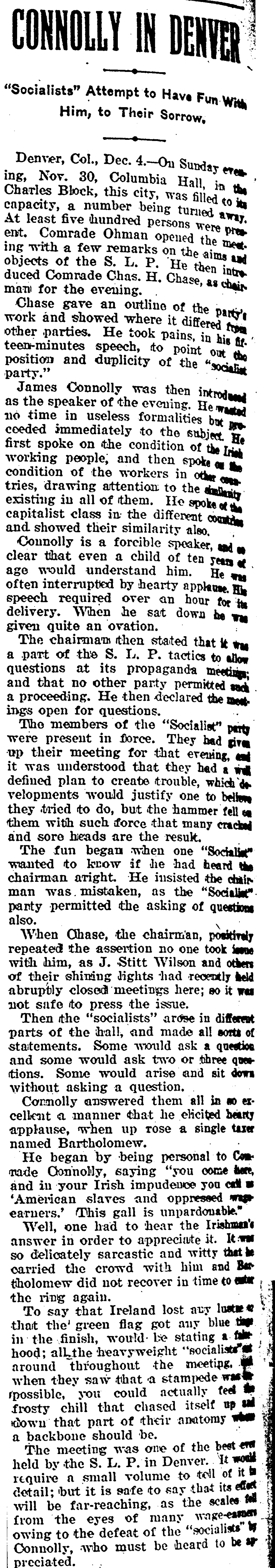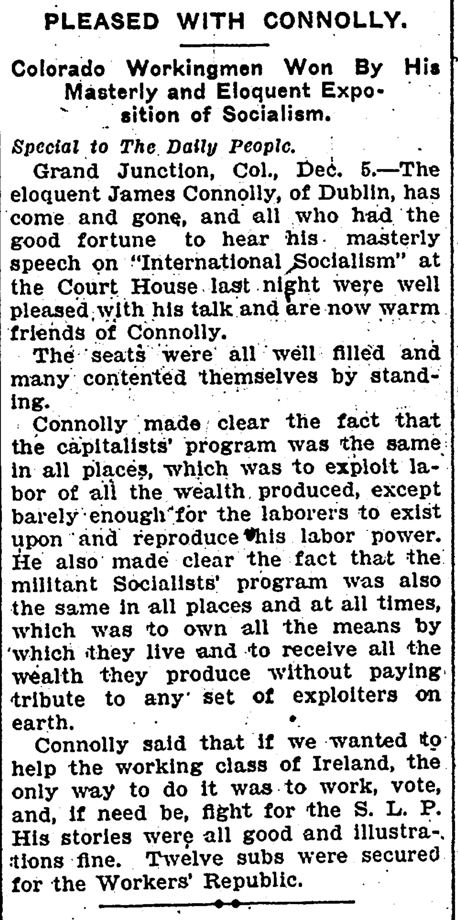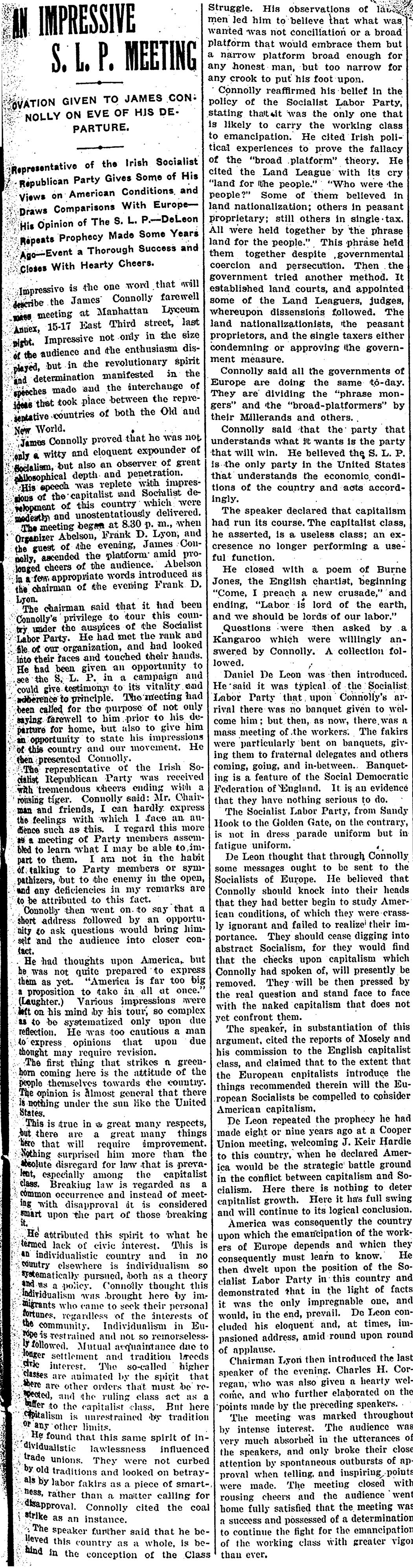 Arriving on September 12 he would speak, starting that very evening, in dozens of cities and towns across the country, several he world make a return visit to. Starting on East Coast, through New York Ohio, Kentucky, Illinois and Missouri up to the Twin Cities and across to Salt Lake City, through California and back through Arizona and Colorado, making encore appearances in certain cities as he worked is way back to New York. Astoundingly, he spoke to a meeting at least once a day from his arrival on September 12 in New York until his December 3rd speech in St. Paul, Minnesota. At a number of these events he engaged in debates with the ‘kangaroos’, largely rightest dissidents who had recently left the S.L.P. to form the Socialist Party. After what can only be described as an exhaustive and successful string of engagements; Connolly was convinced to return to live in the U.S. the following with his family to live and work for the party. The S.L.P. put on a grand event at the Manhattan Lyceum Annex in The Bowery on December 26, 1902 to wish him farewell, celebrate his and their success, and, as always, build the Party.