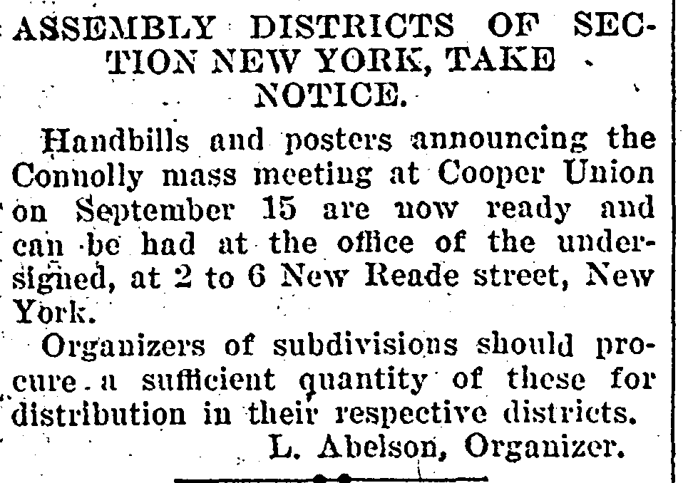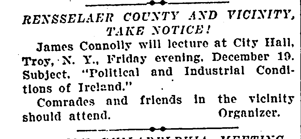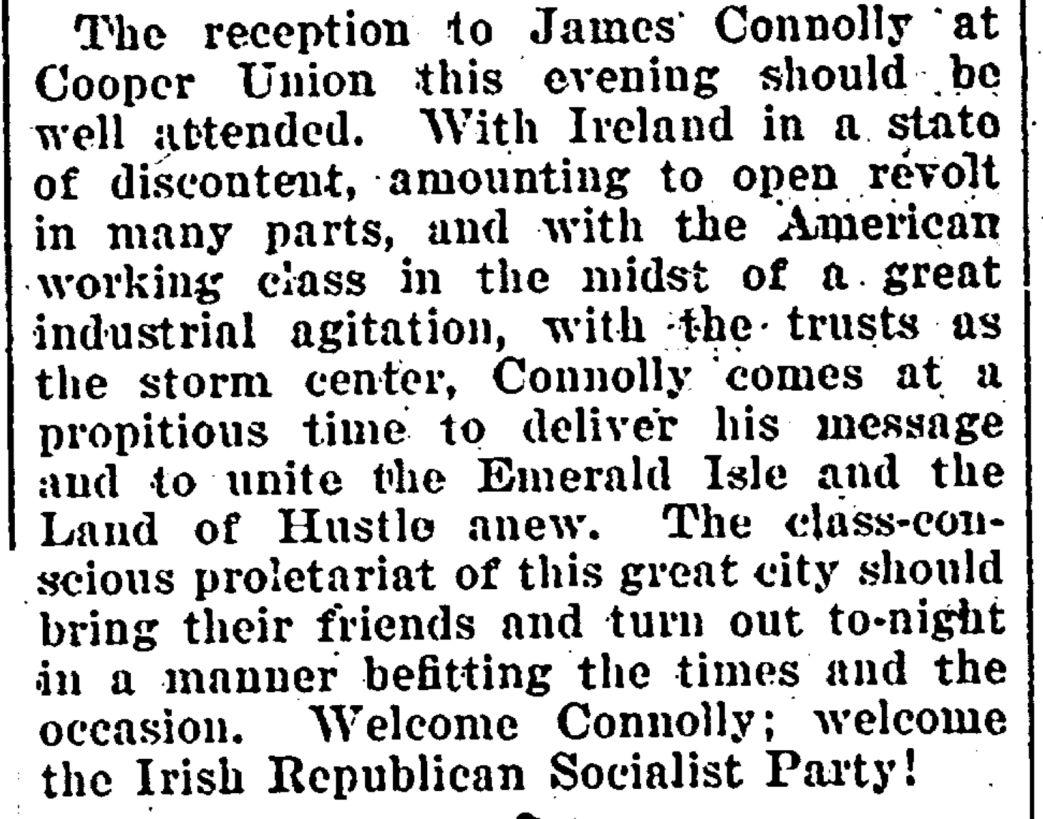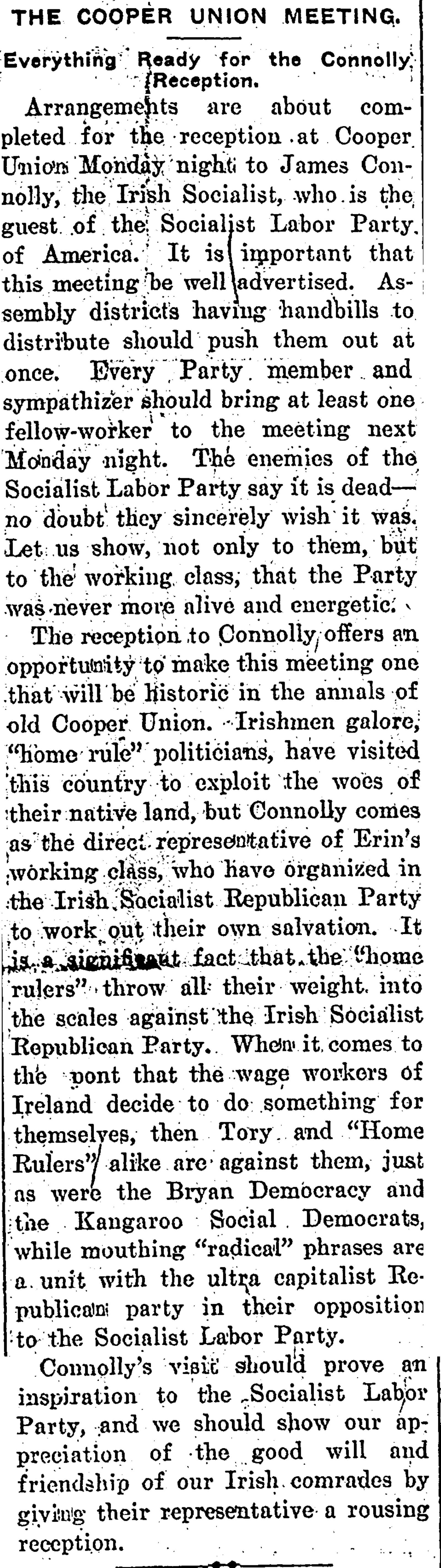 Preparing for Connolly’s arrival with meetings and flyer distributions for his his first engagements, including at, perhaps, the most famous lecture hall in the United States, New York’s Cooper Union. Along with his arrival, his engagements at Cooper Union, in Paterson, Hudson and Yonkers are reported. As well as one of a number of letters the papers would print from Connolly during his tour.