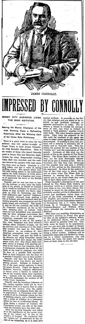 Front page report on the beginning of James Connolly’s 1902 speaking tour.