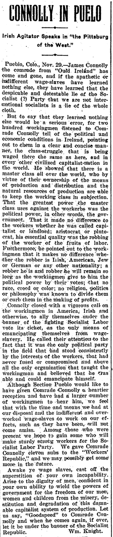 Connolly’s western swing continues with stops at Denver, Pueblo, Los Angeles, and Junction City, along with plans for a second Detroit visit and his lecture in what would become his future home of Troy, New Yorl, as well as another letter from the road by Connolly.