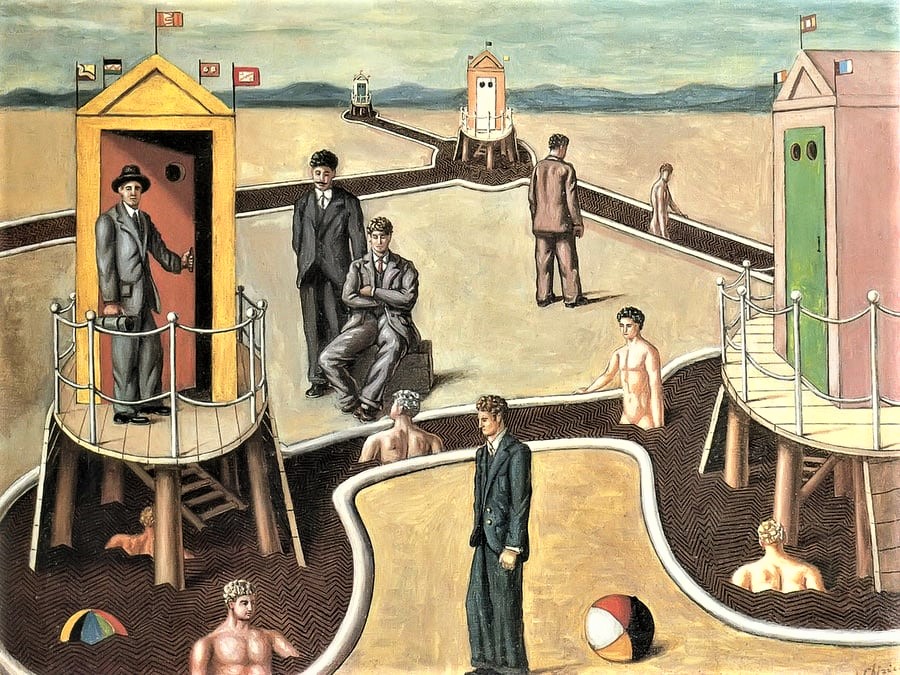Chirico solved the problem of form by a complete evasion. His early lyric paintings, where the long shadow of late afternoon and of green twilight inundates landscapes of ruined cities sleeping by the wine-dark sea, gave us many charming illustrations. This illustrated elegy on the death of time and space, this romantic yearning for the lost golden age of Greece, is now supplanted by ornament. Movement, expressed in his fantastic horses, is stilled-in the present pictures a horse dies on the seashore; another horse is placed alive in a sarcophagus, and finally two dead horses are displayed in a store window. At the same time, the hushed nacreous grey of twilight is flushed with a brownish golden tone. The deliberate mystifying “Mysterious Bathers” series displays nude youths bathing in a river of geometric herringbone design of endless pattern- their bodies already submerged in the muddy brown net, while over all is poured the somber gold light of the mosaic art. The world of magic sends its shimmering golden light over the world of the dying senses. A new iconoclasm from the east destroys the classic motifs. Chirico’s art has become a graphic ornament in two dimensions—1he too has come to the end of a road.